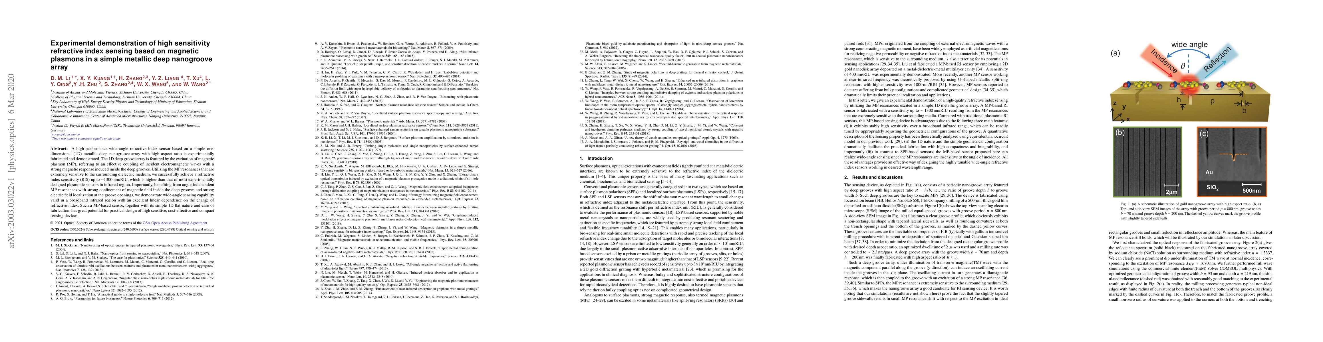 This paper demonstrates a high-sensitivity refractive index sensor using a 1D metallic deep nanogroove array that excites magnetic plasmons, achieving a sensitivity of up to 1300 nm/RIU. The sensor exhibits wide-angle sensing capabilities and is simple to fabricate, promising for practical, cost-effective, and compact sensing applications.