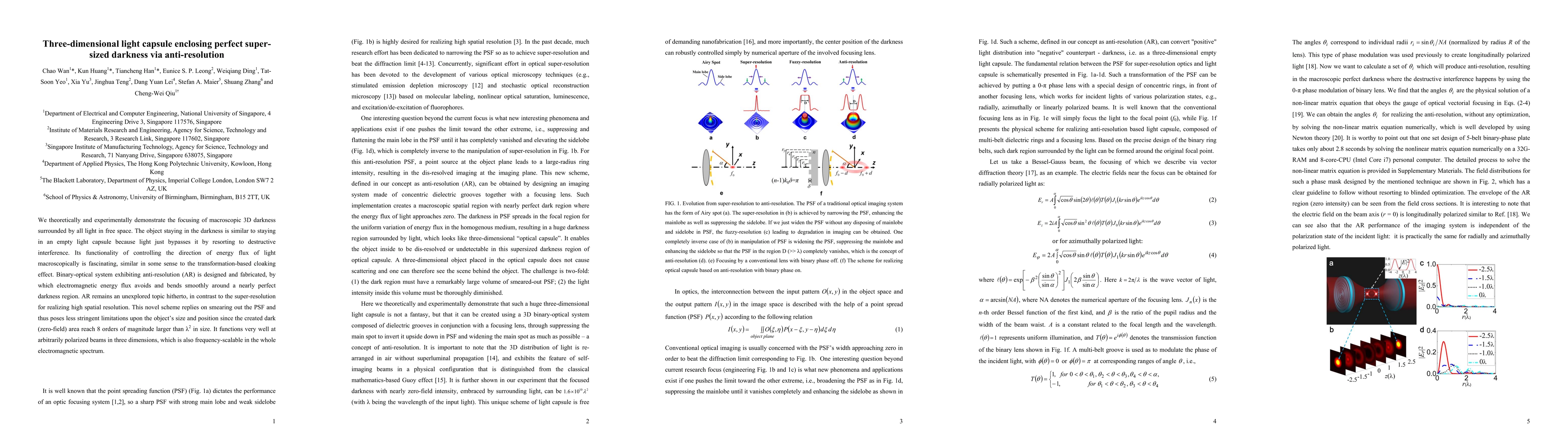 We theoretically and experimentally demonstrate the focusing of macroscopic 3D darkness surrounded by all light in free space. The object staying in the darkness is similar to staying in an empty light capsule because light just bypasses it by resorting to destructive interference. Its functionality of controlling the direction of energy flux of light macroscopically is fascinating, similar in some sense to the transformation-based cloaking effect. Binary-optical system exhibiting anti-resolution (AR) is designed and fabricated, by which electromagnetic energy flux avoids and bends smoothly around a nearly perfect darkness region. AR remains an unexplored topic hitherto, in contrast to the super-resolution for realizing high spatial resolution. This novel scheme replies on smearing out the PSF and thus poses less stringent limitations upon the object's size and position since the created dark (zero-field) area reach 8 orders of magnitude larger than the square of wavelength in size. It functions very well at arbitrarily polarized beams in three dimensions, which is also frequency-scalable in the whole electromagnetic spectrum.