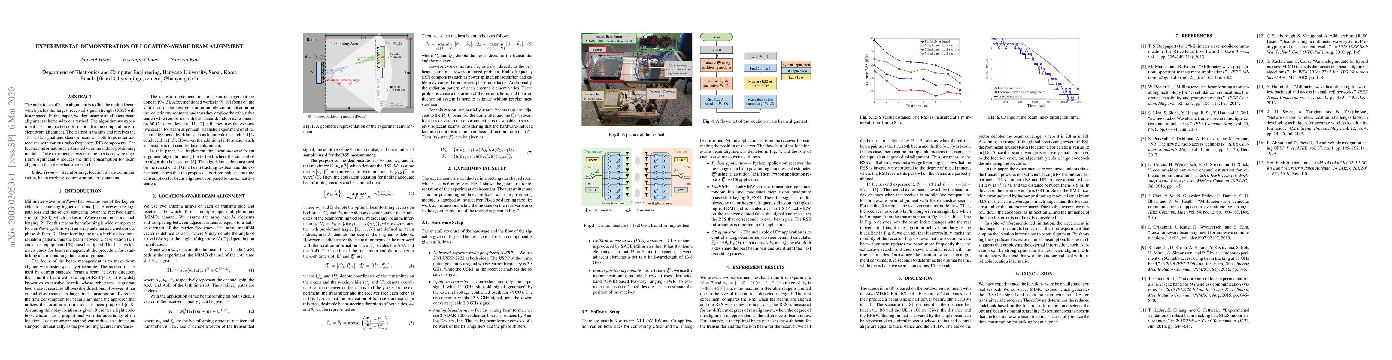 The main focus of beam alignment is to find the optimal beam which yields the largest received signal strength (RSS) with faster speed.In this paper, we demonstrate an efficient beam alignment scheme with our testbed. The algorithm we experiment uses the location information for the computation efficient beam alignment.The testbed transmits and receives the 13.8 GHz signal and steers a beam on both transmitter and receiver with various radio frequency (RF) components. The location information is estimated with the indoor positioning module. The experiment shows that the location-aware algorithm significantly reduces the time consumption for beam alignment than the exhaustive search.