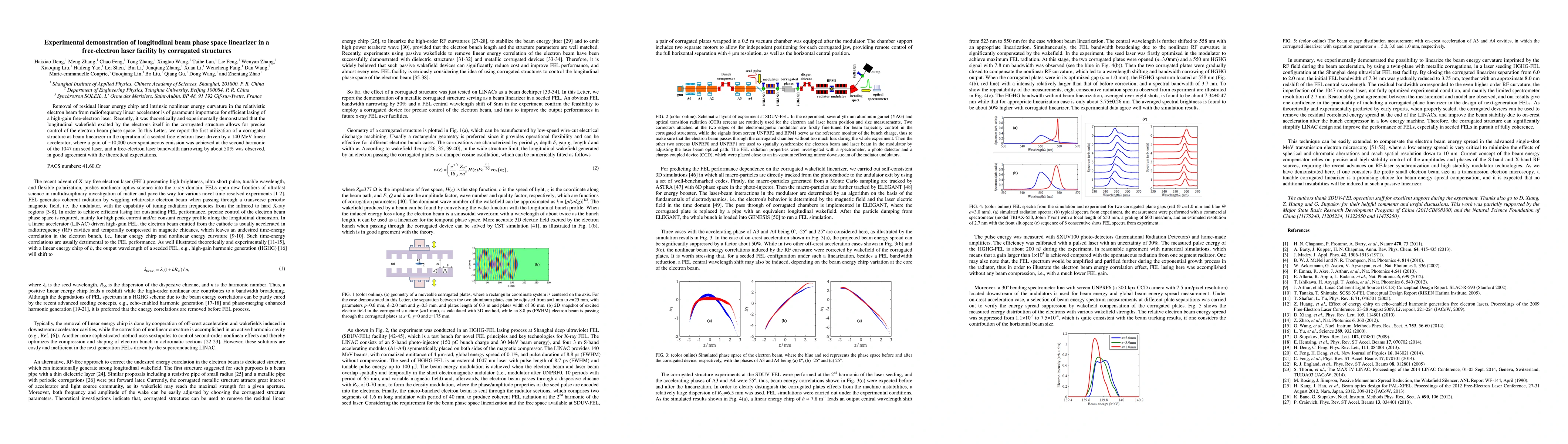 This paper demonstrates the use of a corrugated structure to linearize the longitudinal phase space of an electron beam in a free-electron laser facility, achieving a significant gain and bandwidth narrowing in the laser operation. The results confirm theoretical predictions of the structure's ability to control beam dynamics and improve lasing efficiency.
