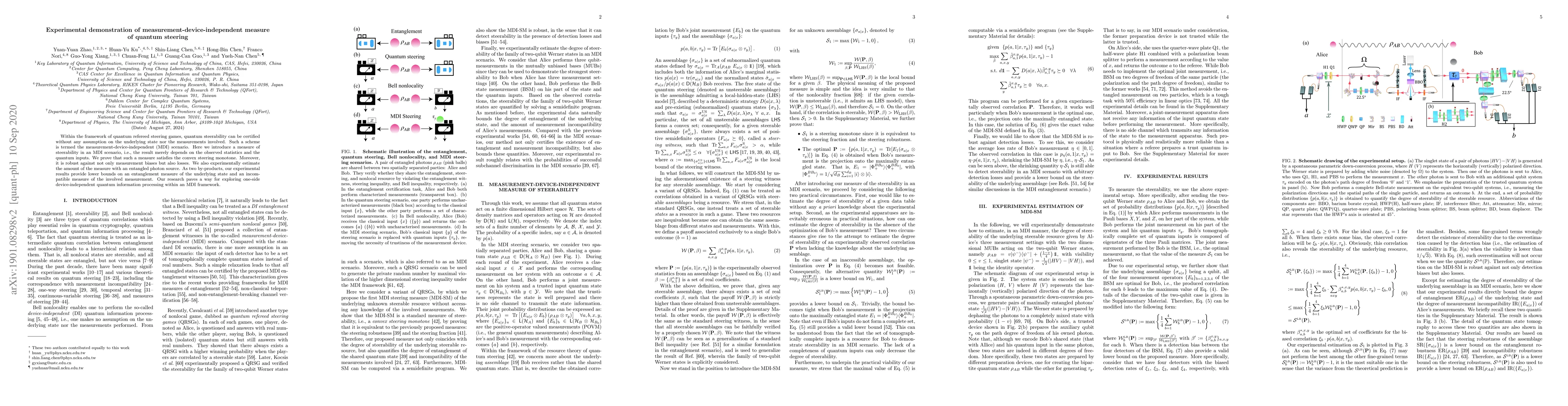 This paper demonstrates the first measurement-device-independent measure of quantum steerability, proving its robustness against measurement biases and losses. Experimental results with an entangled photon source provide lower bounds on entanglement and measurement measures, paving the way for one-sided device-independent quantum information processing.