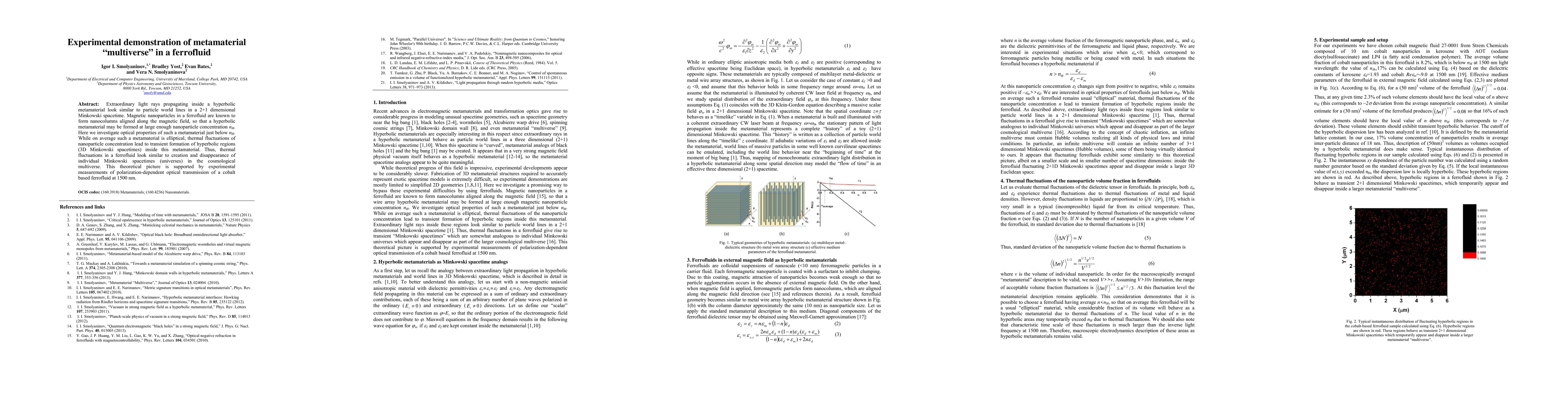 Extraordinary light rays propagating inside a hyperbolic metamaterial look similar to particle world lines in a 2+1 dimensional Minkowski spacetime [1]. Magnetic nanoparticles in a ferrofluid are known to form nanocolumns aligned along the magnetic field, so that a hyperbolic metamaterial may be formed at large enough nanoparticle concentration nH. Here we investigate optical properties of such a metamaterial just below nH. While on average such a metamaterial is elliptical, thermal fluctuations of nanoparticle concentration lead to transient formation of hyperbolic regions (3D Minkowski spacetimes) inside this metamaterial. Thus, thermal fluctuations in a ferrofluid look similar to creation and disappearance of individual Minkowski spacetimes (universes) in the cosmological multiverse. This theoretical picture is supported by experimental measurements of polarization-dependent optical transmission of a cobalt based ferrofluid at 1500 nm.