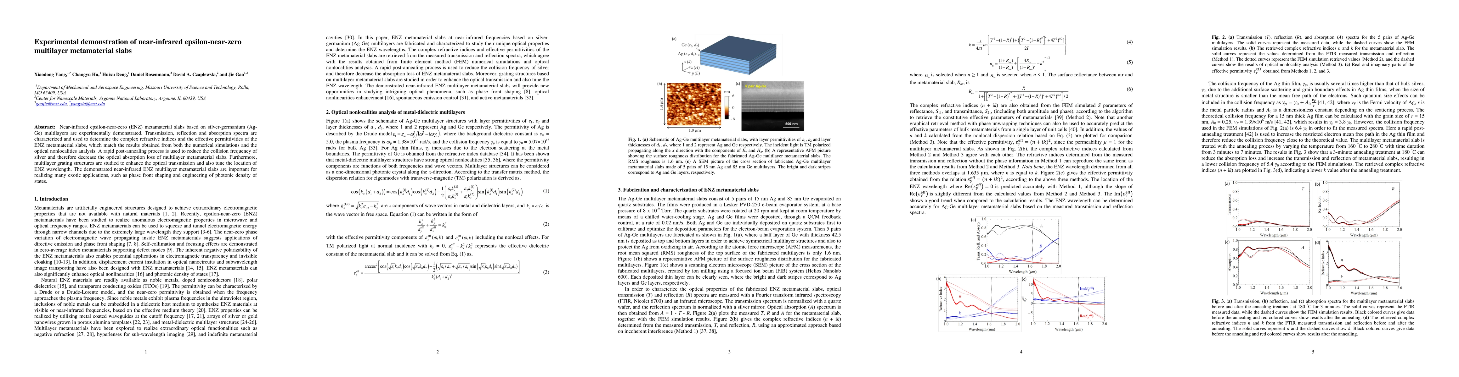 This paper experimentally demonstrates near-infrared epsilon-near-zero (ENZ) metamaterial slabs made from silver-germanium multilayers, showing effective permittivity matching with simulations and reduced optical loss via post-annealing. The study also explores multilayer grating structures for enhanced transmission and ENZ wavelength tuning.