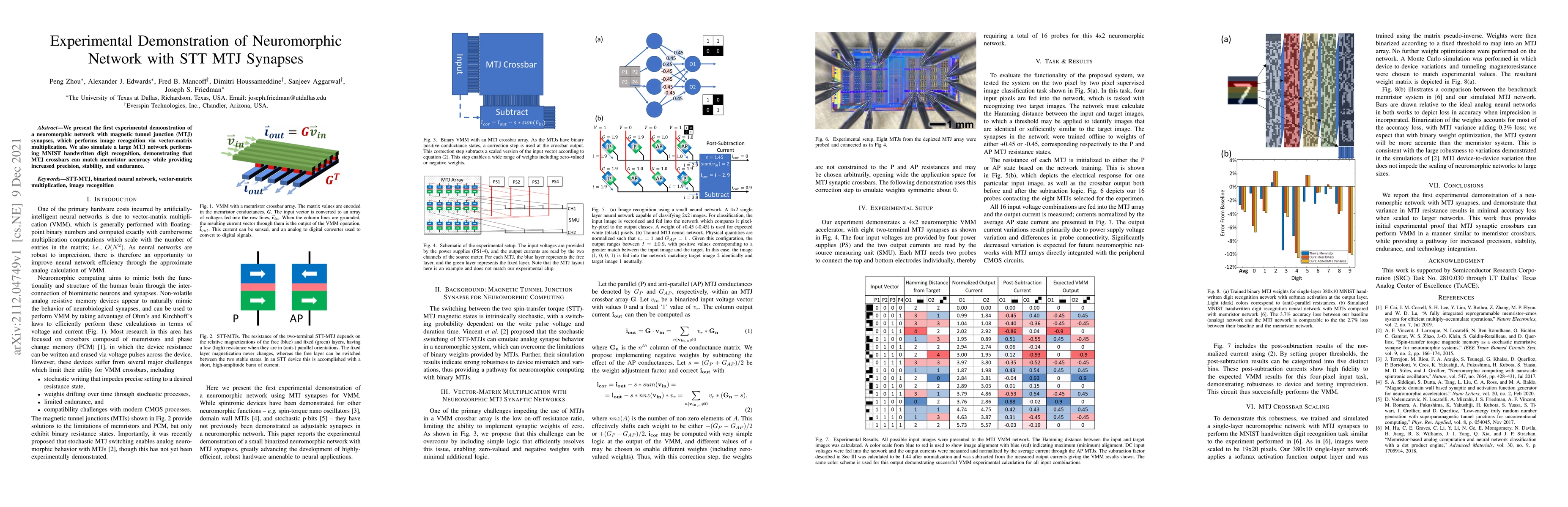 We present the first experimental demonstration of a neuromorphic network with magnetic tunnel junction (MTJ) synapses, which performs image recognition via vector-matrix multiplication. We also simulate a large MTJ network performing MNIST handwritten digit recognition, demonstrating that MTJ crossbars can match memristor accuracy while providing increased precision, stability, and endurance.