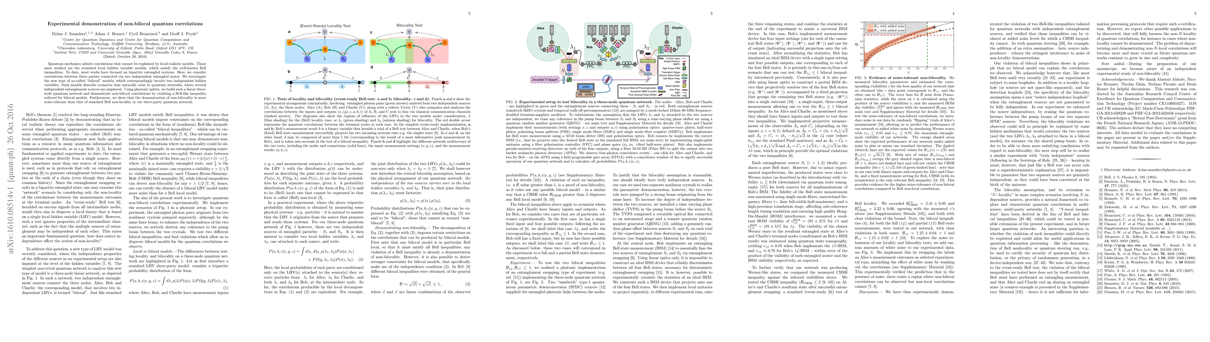 Quantum mechanics admits correlations that cannot be explained by local realistic models. Those most studied are the standard local hidden variable models, which satisfy the well-known Bell inequalities. To date, most works have focused on bipartite entangled systems. Here, we consider correlations between three parties connected via two independent entangled states. We investigate the new type of so-called "bilocal" models, which correspondingly involve two independent hidden variables. Such models describe scenarios that naturally arise in quantum networks, where several independent entanglement sources are employed. Using photonic qubits, we build such a linear three-node quantum network and demonstrate non-bilocal correlations by violating a Bell-like inequality tailored for bilocal models. Furthermore, we show that the demonstration of non-bilocality is more noise-tolerant than that of standard Bell non-locality in our three-party quantum network.