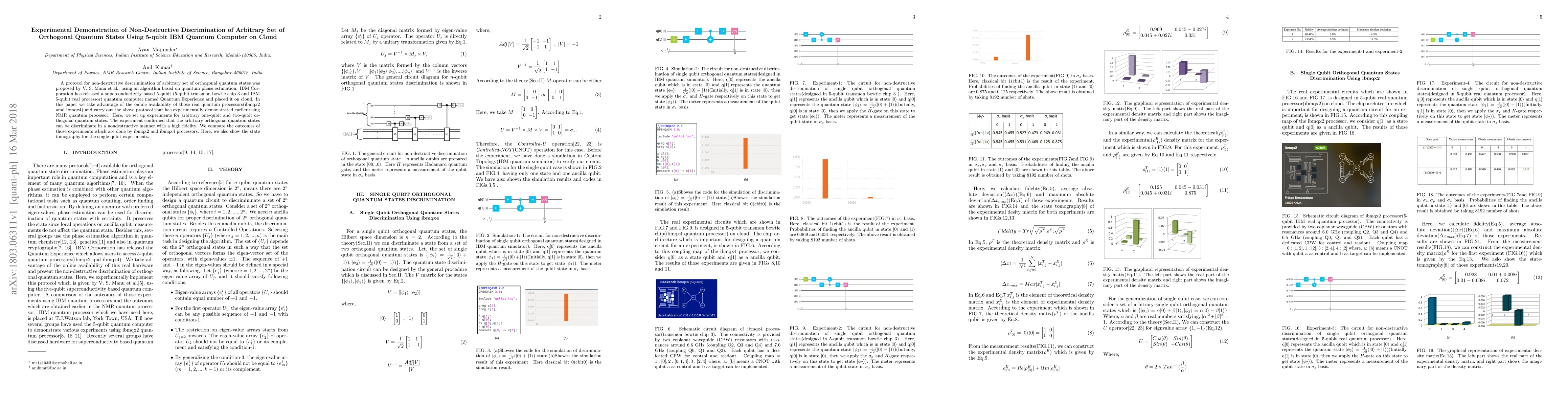 This paper demonstrates the non-destructive discrimination of arbitrary orthogonal quantum states using IBM's 5-qubit quantum computer on cloud, confirming earlier NMR-based results with high fidelity. Experiments on ibmqx2 and ibmqx4 processors show comparable outcomes, with state tomography validating single qubit results.