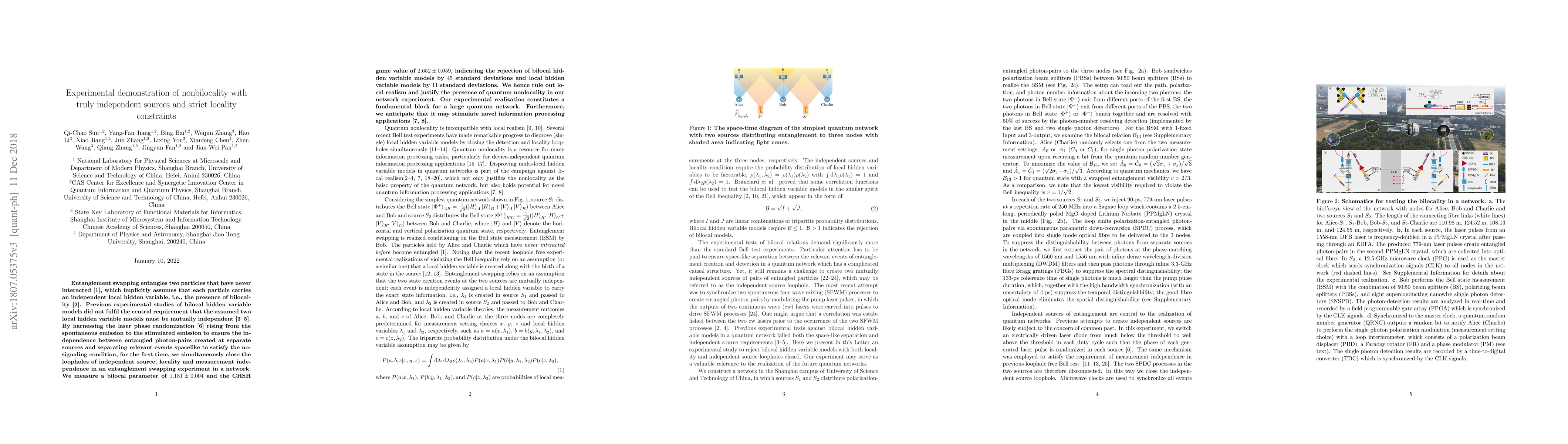 This paper demonstrates nonbilocality in an entanglement swapping experiment using independent photon sources and strict locality constraints, closing all major loopholes. The results reject bilocal hidden variable models by 45 standard deviations and local hidden variable models by 11 standard deviations, confirming quantum nonlocality and paving the way for quantum network applications.