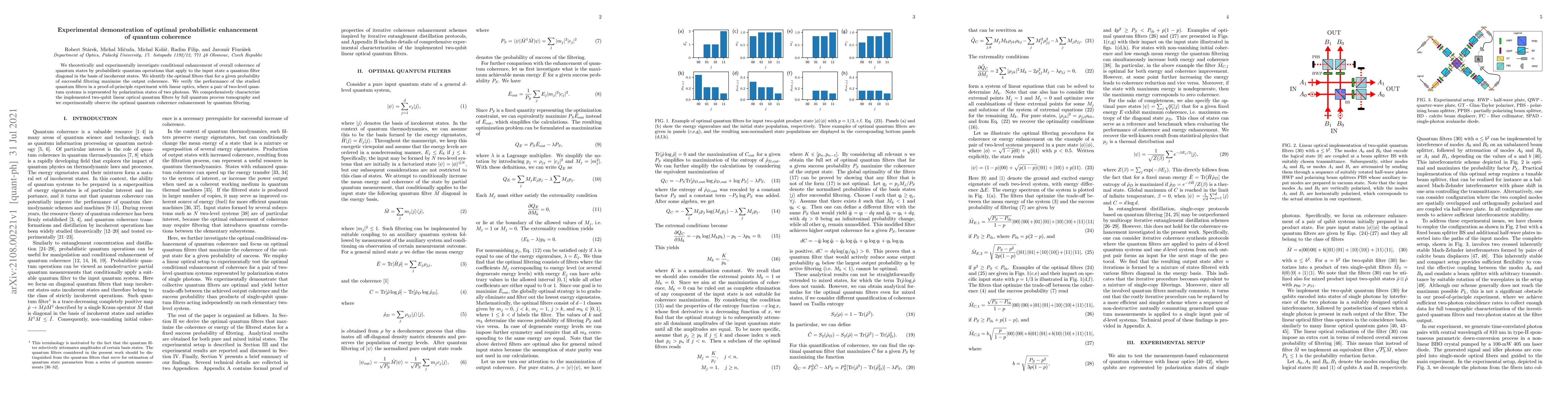 This paper presents both theoretical and experimental evidence for enhancing the coherence of quantum states through optimal probabilistic quantum filtering. The study identifies and verifies the performance of the best quantum filters in a linear optics experiment using photon polarization states, demonstrating significant coherence enhancement.