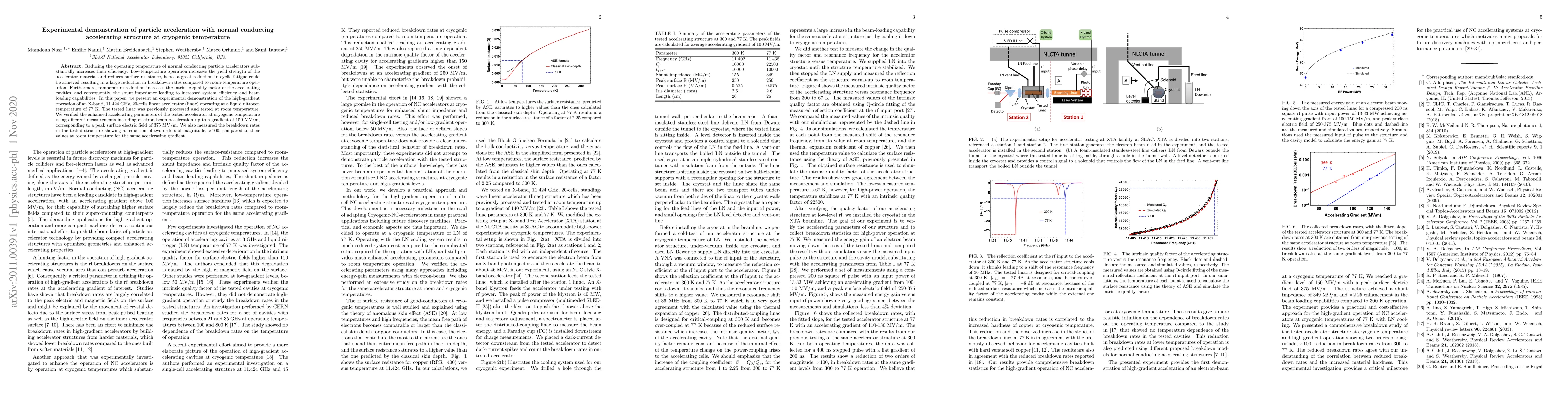Reducing the operating temperature of normal conducting particle accelerators substantially increases their efficiency. Low-temperature operation increases the yield strength of the accelerator material and reduces surface resistance, hence a great reduction in cyclic fatigue could be achieved resulting in a large reduction in breakdown rates compared to room-temperature operation. Furthermore, temperature reduction increases the intrinsic quality factor of the accelerating cavities, and consequently, the shunt impedance leading to increased system efficiency and beam loading capabilities. In this paper, we present an experimental demonstration of the high-gradient operation of an X-band, 11.424 GHz, 20-cells linear accelerator (linac) operating at a liquid nitrogen temperature of 77 K. The tested linac was previously processed and tested at room temperature. We verified the enhanced accelerating parameters of the tested accelerator at cryogenic temperature using different measurements including electron beam acceleration up to a gradient of 150 MV/m, corresponding to a peak surface electric field of 375 MV/m. We also measured the breakdown rates in the tested structure showing a reduction of two orders of magnitude, x100, compared to their values at room temperature for the same accelerating gradient.