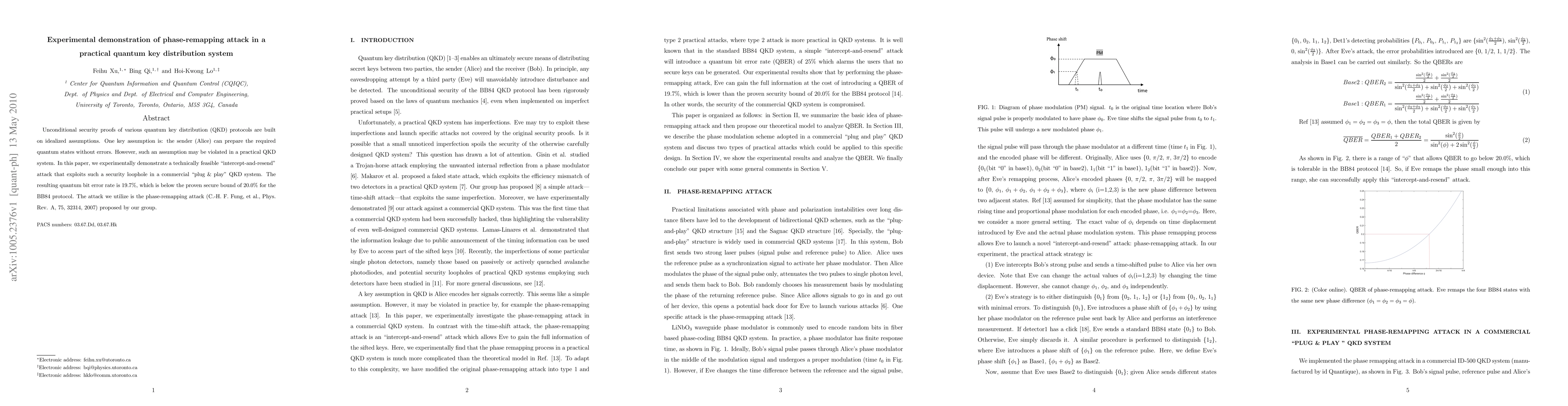 This paper experimentally demonstrates a phase-remapping attack on a practical quantum key distribution system, exploiting a security loophole in the idealized assumption that the sender can prepare quantum states without errors. The attack achieves a quantum bit error rate of 19.7%, below the secure bound of 20.0% for the BB84 protocol.