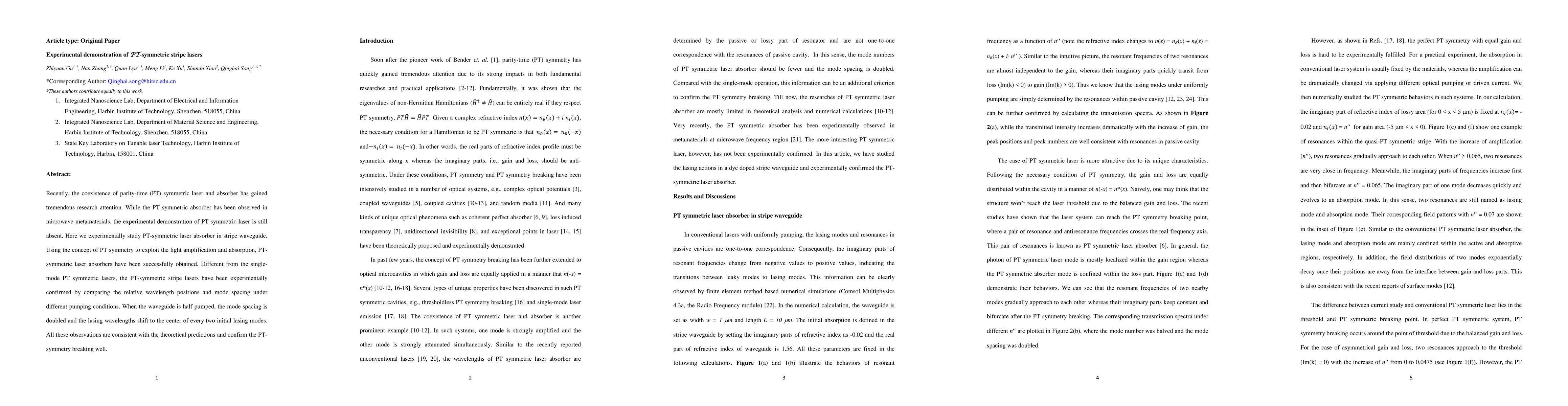 This paper experimentally demonstrates the first PT-symmetric stripe lasers, confirming their existence through comparative analysis of wavelength positions and mode spacing under varying pumping conditions. The results align with theoretical predictions, showcasing PT-symmetry breaking when the waveguide is half-pumped.