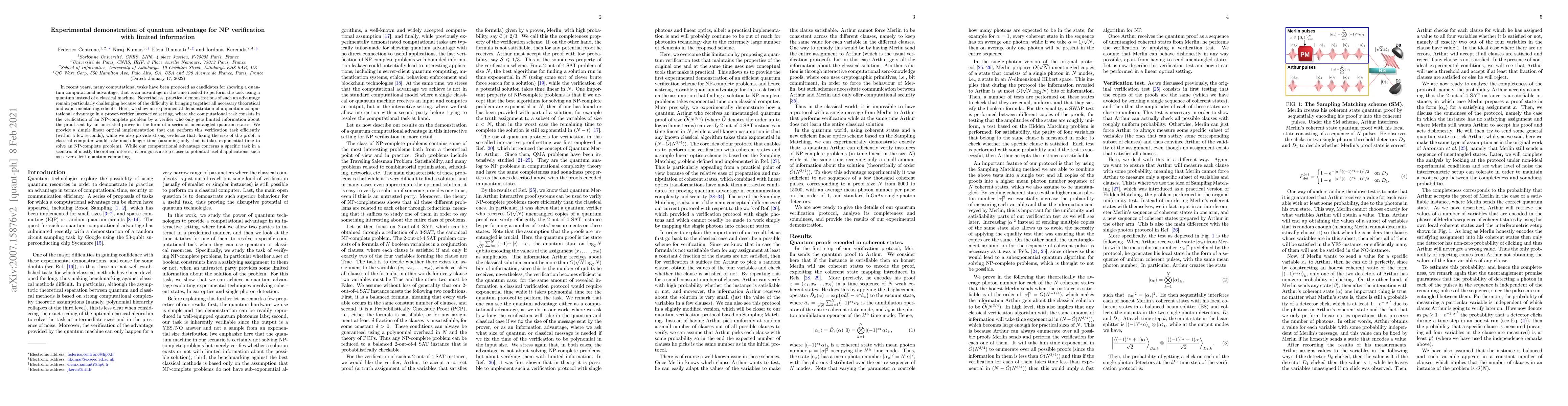 This paper demonstrates a quantum computational advantage in an NP verification task where a verifier receives limited information in the form of unentangled quantum states from an untrusted prover, showing efficient verification in a few seconds. It suggests that a classical computer would take significantly longer, hinting at potential quantum computing applications.