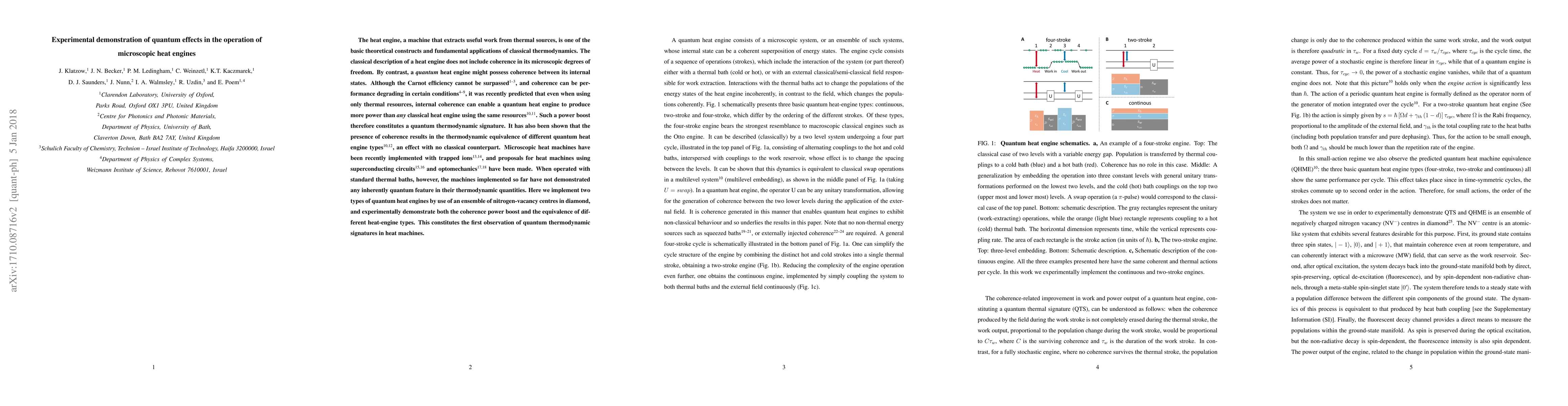 This paper demonstrates quantum effects in microscopic heat engines using nitrogen-vacancy centres in diamond, showing a coherence power boost and thermodynamic equivalence of different engine types, marking the first observation of quantum thermodynamic signatures in heat machines.