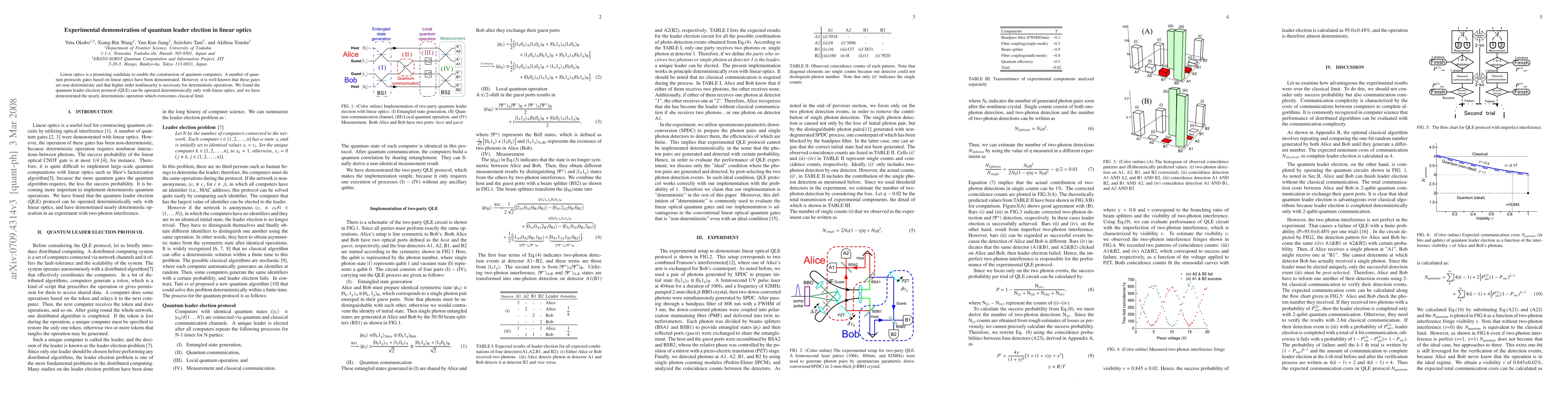 Linear optics is a promising candidate to enable the construction of quantum computers. A number of quantum protocols gates based on linear optics have been demonstrated. However, it is well-known that these gates are non-deterministic and that higher order nonlinearity is necessary for deterministic operations. We found the quantum leader election protocol (QLE) can be operated deterministically only with linear optics, and we have demonstrated the nearly deterministic operation which overcomes classical limit.