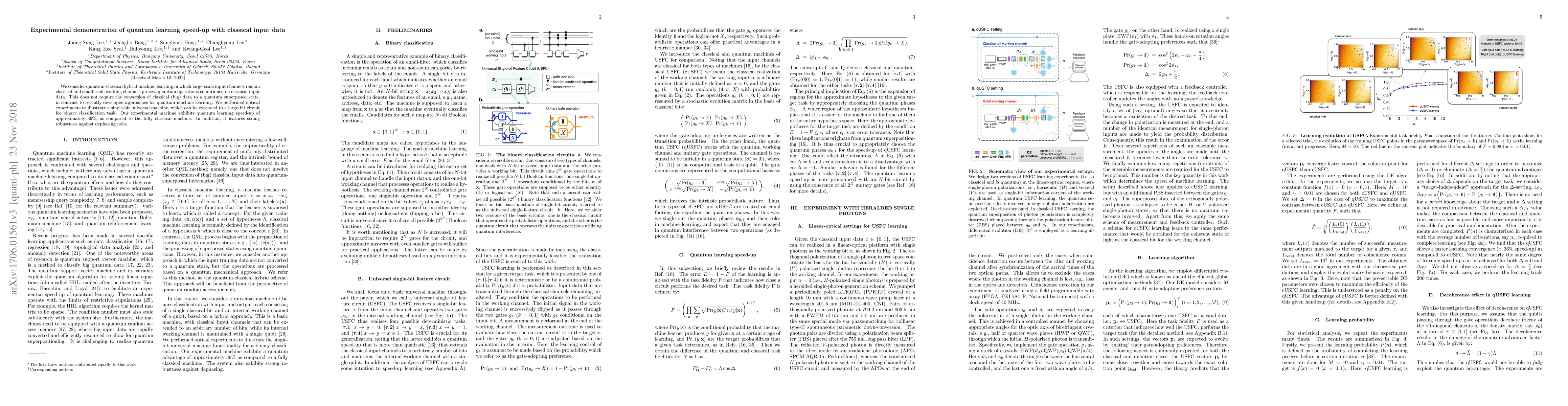 We consider quantum-classical hybrid machine learning in which large-scale input channels remain classical and small-scale working channels process quantum operations conditioned on classical input data. This does not require the conversion of classical (big) data to a quantum superposed state, in contrast to recently developed approaches for quantum machine learning. We performed optical experiments to illustrate a single-bit universal machine, which can be extended to a large-bit circuit for binary classification task. Our experimental machine exhibits quantum learning speed-up of approximately 36%, as compared to the fully classical machine. In addition, it features strong robustness against dephasing noise.