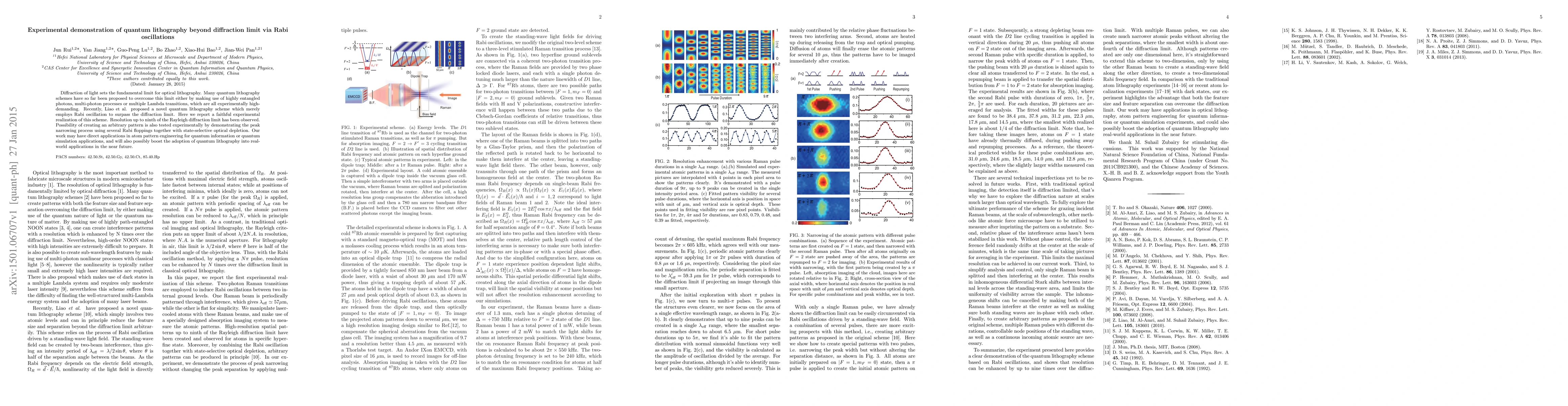 This paper demonstrates an experimental realization of quantum lithography using Rabi oscillations to surpass the diffraction limit, achieving resolution up to one-ninth of the Rayleigh limit. The study also tests the feasibility of creating arbitrary patterns through peak narrowing via multiple Rabi floppings and state-selective optical depletion.