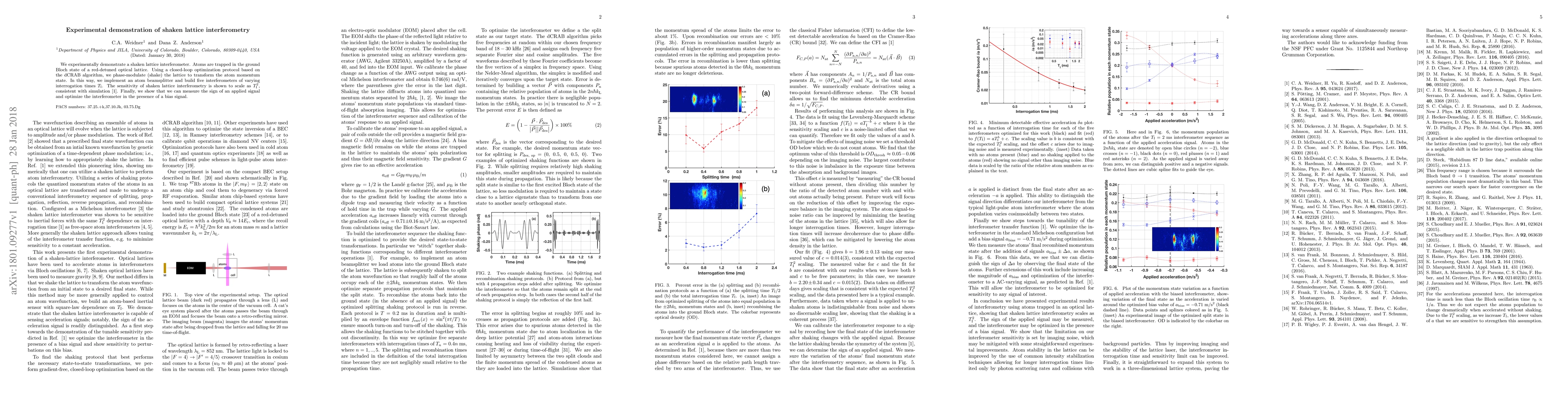 We experimentally demonstrate a shaken lattice interferometer. Atoms are trapped in the ground Bloch state of a red-detuned optical lattice. Using a closed-loop optimization protocol based on the dCRAB algorithm, we phase-modulate (shake) the lattice to transform the atom momentum state. In this way, we implement an atom beamsplitter and build five interferometers of varying interrogation times $T_I$. The sensitivity of shaken lattice interferometry is shown to scale as $T_I^2$, consistent with simulation [1]. Finally, we show that we can measure the sign of an applied signal and optimize the interferometer in the presence of a bias signal. [1] C. A. Weidner, H. Yu, R. Kosloff, and D. Z. Anderson, Phys. Rev. A 95, 043624 (2017).
