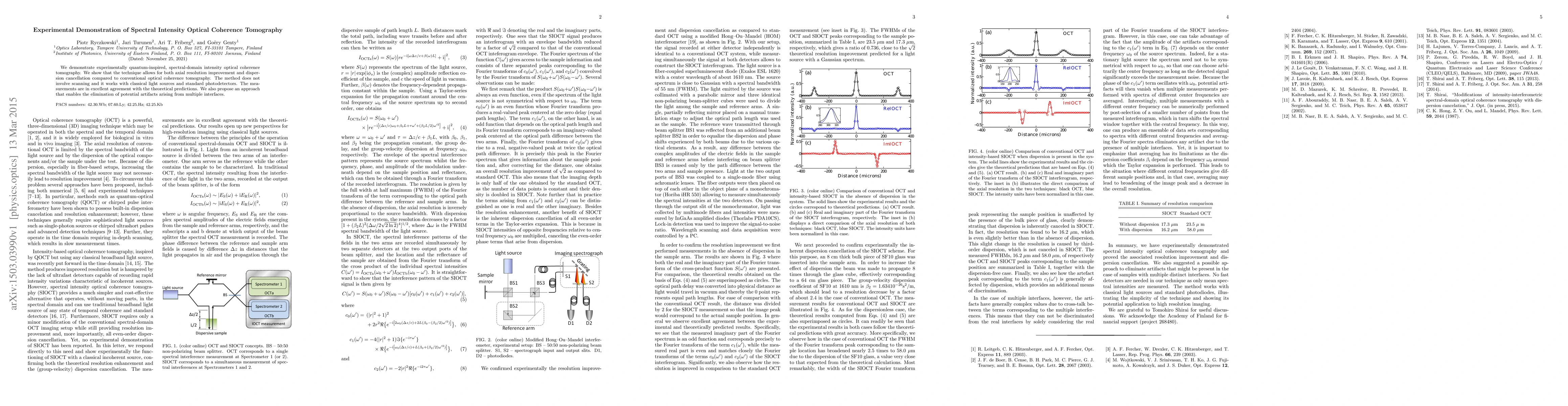 This paper experimentally validates a quantum-inspired spectral-domain intensity optical coherence tomography technique that enhances axial resolution and cancels dispersion without scanning, using classical light sources and standard photodetectors, with results aligning well with theory. It also suggests a method to mitigate artifacts from multiple interfaces.