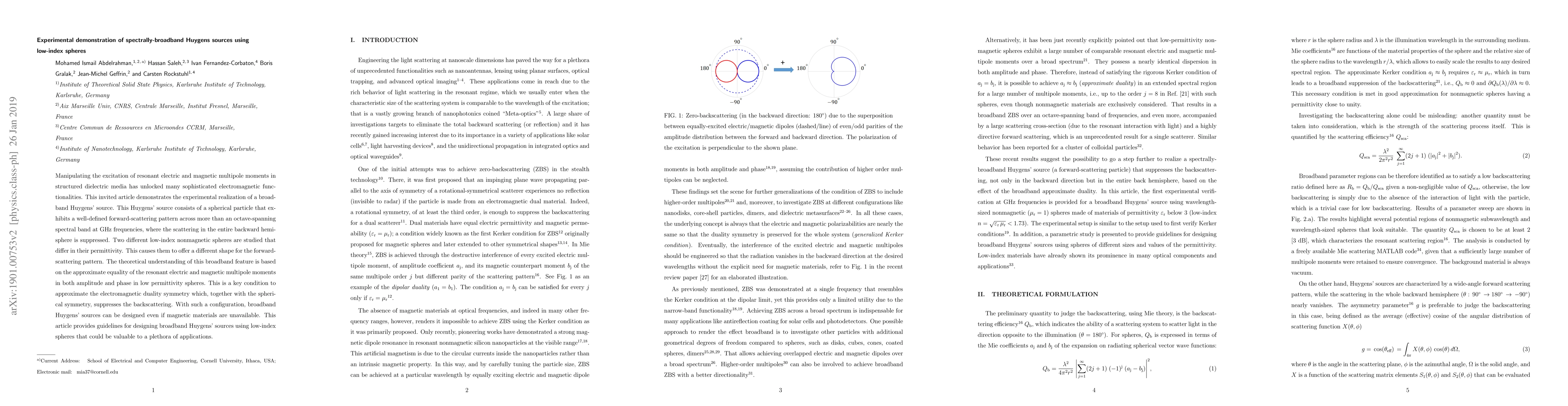 Manipulating the excitation of resonant electric and magnetic multipole moments in structured dielectric media has unlocked many sophisticated electromagnetic functionalities. This article demonstrates the experimental realization of a broadband Huygens' source. This Huygens' source consists of a spherical particle that exhibits a well-defined forward-scattering pattern across more than an octave-spanning spectral band at GHz frequencies, where the scattering in the entire backward hemisphere is suppressed. Two different low-index nonmagnetic spheres are studied that differ in their permittivity. This causes them to offer a different shape for the forward-scattering pattern. The theoretical understanding of this broadband feature is based on the approximate equality of the resonant electric and magnetic multipole moments in both amplitude and phase in low permittivity spheres. This is a key condition to approximate the electromagnetic duality symmetry which, together with the spherical symmetry, suppresses the backscattering. With such a configuration, broadband Huygens' sources can be designed even if magnetic materials are unavailable. This article provides guidelines for designing broadband Huygens' sources using low-index spheres that could be valuable to a plethora of applications.