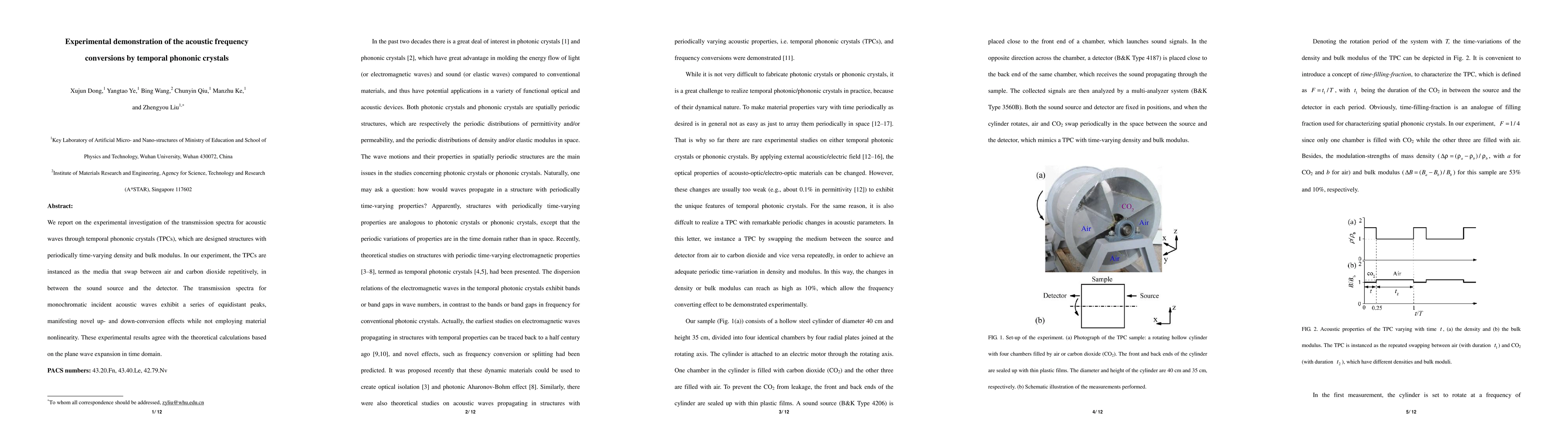 We report on the experimental investigation of the transmission spectra for acoustic waves through temporal phononic crystals (TPCs), which are designed structures with periodically time-varying density and bulk modulus. In our experiment, the TPCs are instanced as the media that swap between air and carbon dioxide repetitively, in between the sound source and the detector. The transmission spectra for monochromatic incident acoustic waves exhibit a series of equidistant peaks, manifesting novel up- and down-conversion effects while not employing material nonlinearity. These experimental results agree with the theoretical calculations based on the plane wave expansion in time domain.