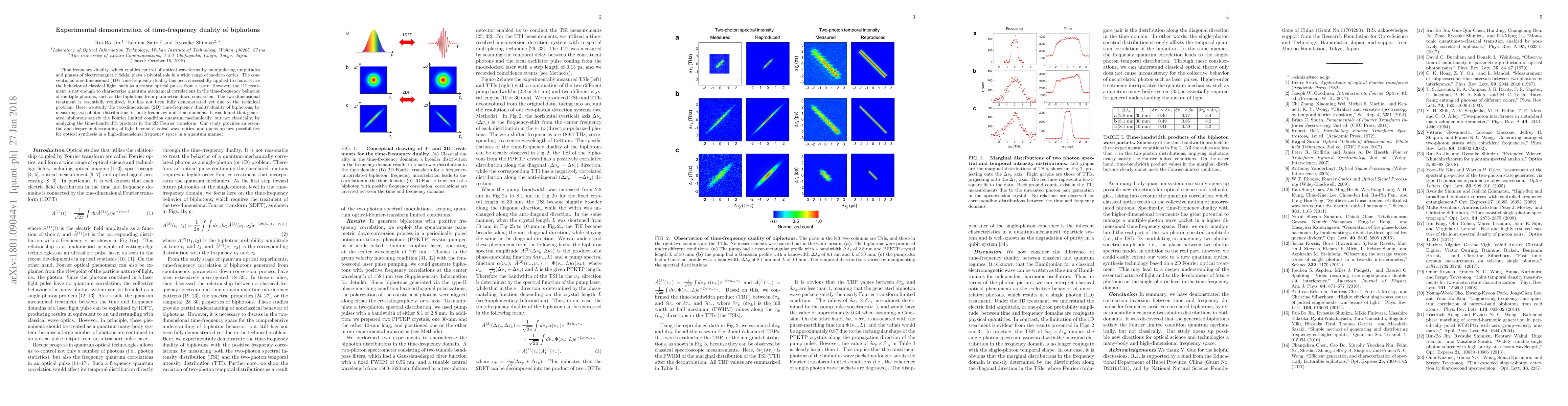 Time-frequency duality, which enables control of optical waveforms by manipulating amplitudes and phases of electromagnetic fields, plays a pivotal role in a wide range of modern optics. The conventional one-dimensional (1D) time-frequency duality has been successfully applied to characterize the behavior of classical light, such as ultrafast optical pulses from a laser. However, the 1D treatment is not enough to characterize quantum mechanical correlations in the time-frequency behavior of multiple photons, such as the biphotons from parametric down conversion. The two-dimensional treatment is essentially required, but has not been fully demonstrated yet due to the technical problem. Here, we study the two-dimensional (2D) time-frequency duality duality of biphotons, by measuring two-photon distributions in both frequency and time domains. It was found that generated biphotons satisfy the Fourier limited condition quantum mechanically, but not classically, by analyzing the time-bandwidth products in the 2D Fourier transform. Our study provides an essential and deeper understanding of light beyond classical wave optics, and opens up new possibilities for optical synthesis in a high-dimensional frequency space in a quantum manner.