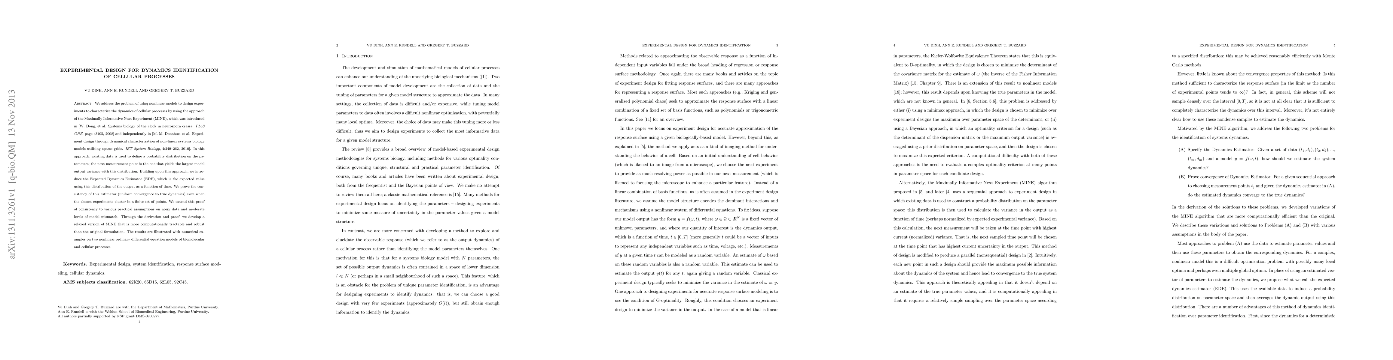 We address the problem of using nonlinear models to design experiments to characterize the dynamics of cellular processes by using the approach of the Maximally Informative Next Experiment (MINE), which was introduced in [W. Dong, et al. Systems biology of the clock in neurospora crassa. {\em PLoS ONE}, page e3105, 2008] and independently in [M. M. Donahue, et al. Experiment design through dynamical characterization of non-linear systems biology models utilising sparse grids. {\em IET System Biology}, 4:249--262, 2010]. In this approach, existing data is used to define a probability distribution on the parameters; the next measurement point is the one that yields the largest model output variance with this distribution. Building upon this approach, we introduce the Expected Dynamics Estimator (EDE), which is the expected value using this distribution of the output as a function of time. We prove the consistency of this estimator (uniform convergence to true dynamics) even when the chosen experiments cluster in a finite set of points. We extend this proof of consistency to various practical assumptions on noisy data and moderate levels of model mismatch. Through the derivation and proof, we develop a relaxed version of MINE that is more computationally tractable and robust than the original formulation. The results are illustrated with numerical examples on two nonlinear ordinary differential equation models of biomolecular and cellular processes.