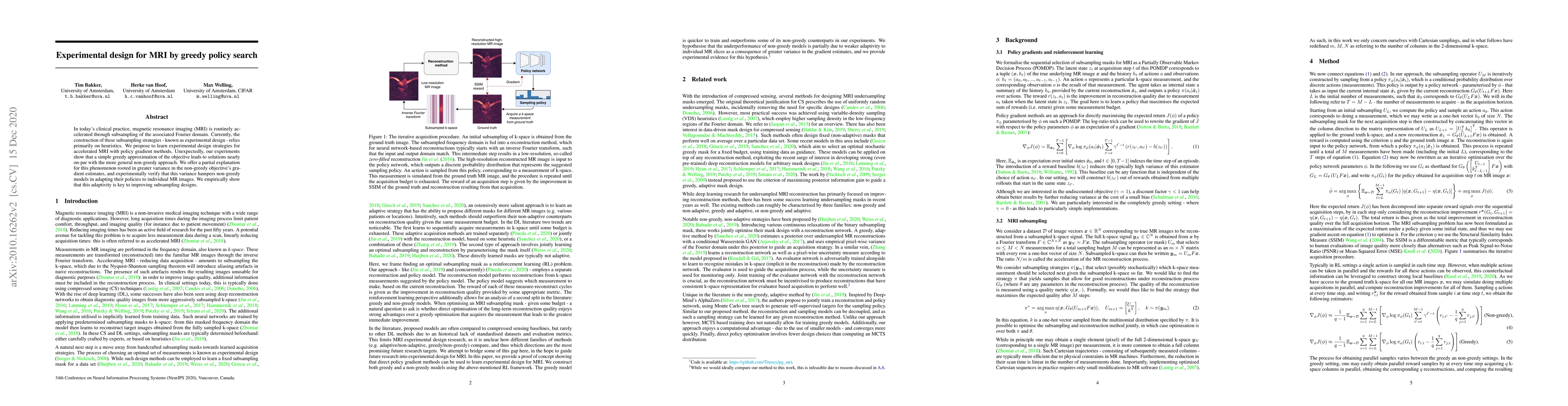 In today's clinical practice, magnetic resonance imaging (MRI) is routinely accelerated through subsampling of the associated Fourier domain. Currently, the construction of these subsampling strategies - known as experimental design - relies primarily on heuristics. We propose to learn experimental design strategies for accelerated MRI with policy gradient methods. Unexpectedly, our experiments show that a simple greedy approximation of the objective leads to solutions nearly on-par with the more general non-greedy approach. We offer a partial explanation for this phenomenon rooted in greater variance in the non-greedy objective's gradient estimates, and experimentally verify that this variance hampers non-greedy models in adapting their policies to individual MR images. We empirically show that this adaptivity is key to improving subsampling designs.