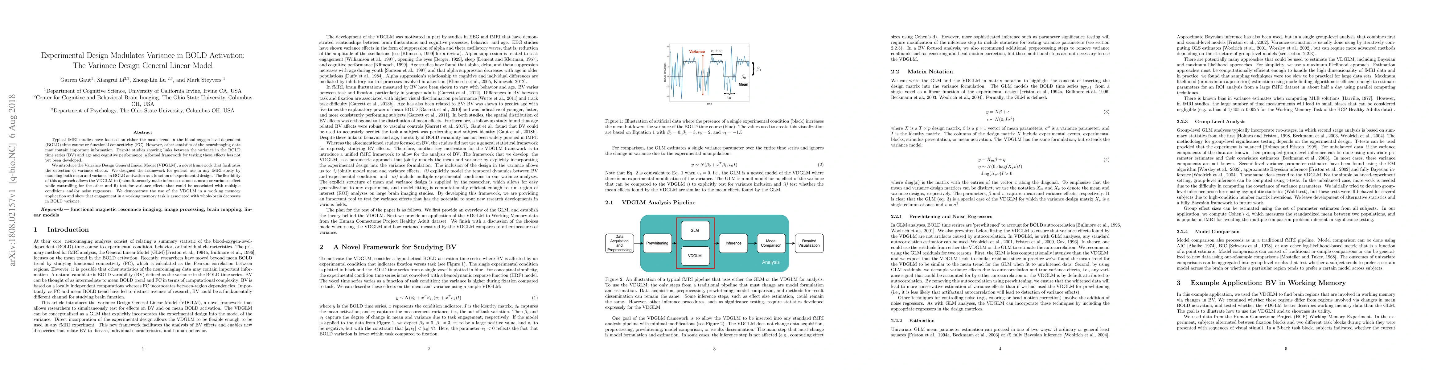 Typical fMRI studies have focused on either the mean trend in the blood-oxygen-level-dependent (BOLD) time course or functional connectivity (FC). However, other statistics of the neuroimaging data may contain important information. Despite studies showing links between the variance in the BOLD time series (BV) and age and cognitive performance, a formal framework for testing these effects has not yet been developed. We introduce the Variance Design General Linear Model (VDGLM), a novel framework that facilitates the detection of variance effects. We designed the framework for general use in any fMRI study by modeling both mean and variance in BOLD activation as a function of experimental design. The flexibility of this approach allows the VDGLM to i) simultaneously make inferences about a mean or variance effect while controlling for the other and ii) test for variance effects that could be associated with multiple conditions and/or noise regressors. We demonstrate the use of the VDGLM in a working memory application and show that engagement in a working memory task is associated with whole-brain decreases in BOLD variance.