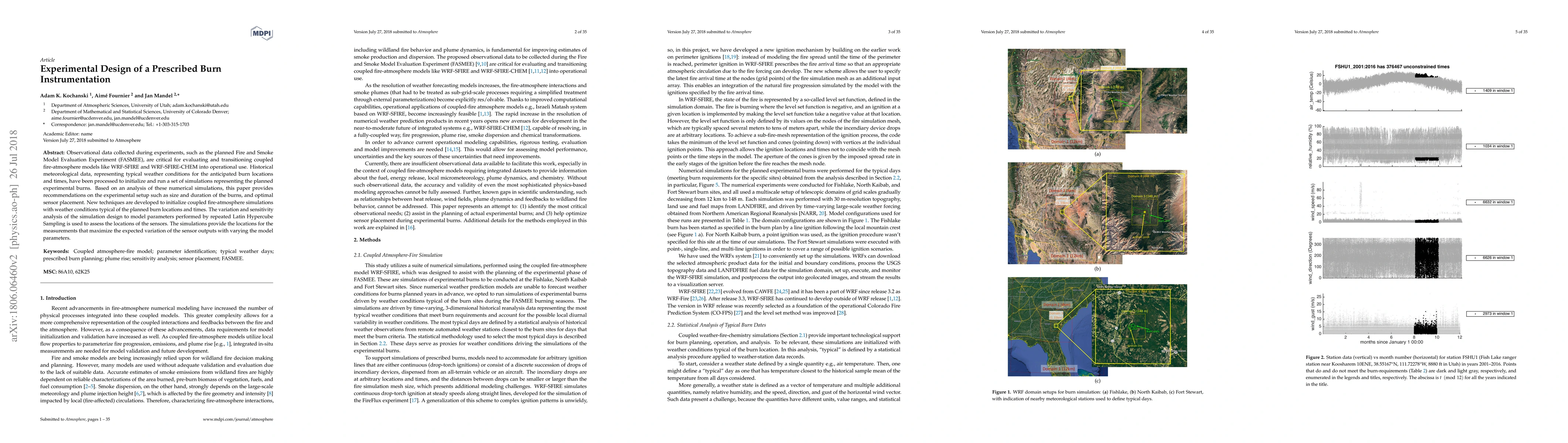 Observational data collected during experiments, such as the planned Fire and Smoke Model Evaluation Experiment (FASMEE), are critical for progressing and transitioning coupled fire-atmosphere models like WRF-SFIRE and WRF-SFIRE-CHEM into operational use. Historical meteorological data, representing typical weather conditions for the anticipated burn locations and times, have been processed to initialize and run a set of simulations representing the planned experimental burns. Based on an analysis of these numerical simulations, this paper provides recommendations on the experimental setup that include the ignition procedures, size and duration of the burns, and optimal sensor placement. New techniques are developed to initialize coupled fire-atmosphere simulations with weather conditions typical of the planned burn locations and time of the year. Analysis of variation and sensitivity analysis of simulation design to model parameters by repeated Latin Hypercube Sampling are used to assess the locations of the sensors. The simulations provide the locations of the measurements that maximize the expected variation of the sensor outputs with the model parameters.