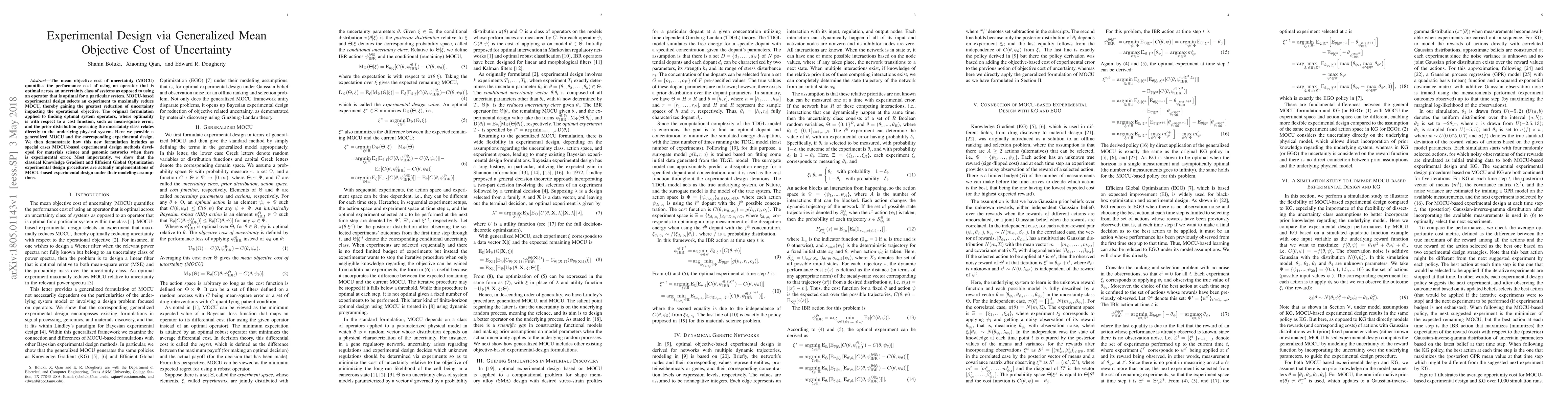 This paper introduces a generalized mean objective cost of uncertainty (MOCU) to optimize experimental design, aiming to reduce uncertainty in system performance. It demonstrates that classical Knowledge Gradient and Efficient Global Optimization methods are specific implementations of MOCU-based experimental design under their respective assumptions.
