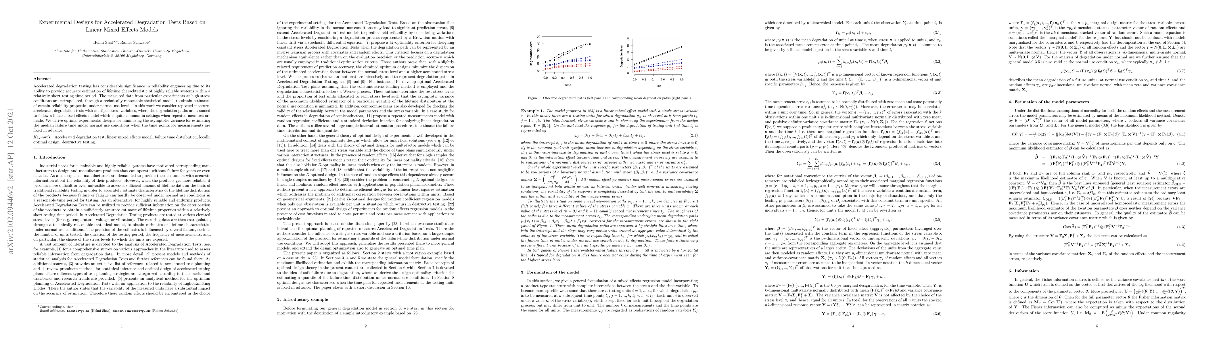 This paper develops optimal experimental designs for accelerated degradation tests using linear mixed effects models, focusing on minimizing the variance for estimating median failure time under normal conditions. It considers both fixed and optimized measurement time points for repeated measures under multiple stress variables.