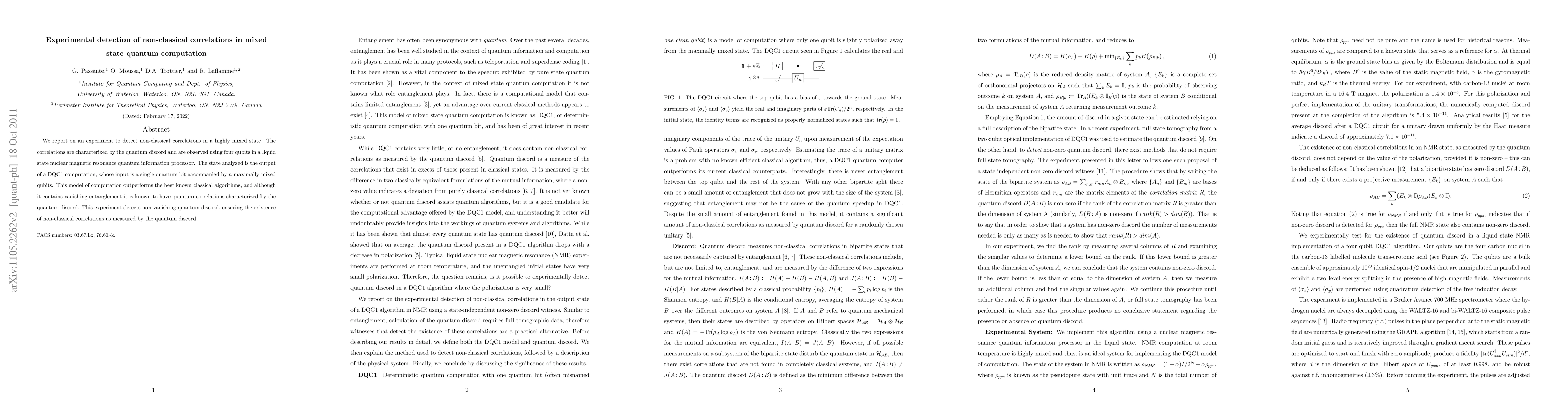 This paper reports an experiment detecting non-classical correlations in a highly mixed quantum state using a liquid state NMR quantum information processor with four qubits. The study reveals quantum discord, confirming the existence of non-classical correlations despite minimal entanglement, demonstrating the superiority of DQC1 computation over classical algorithms.