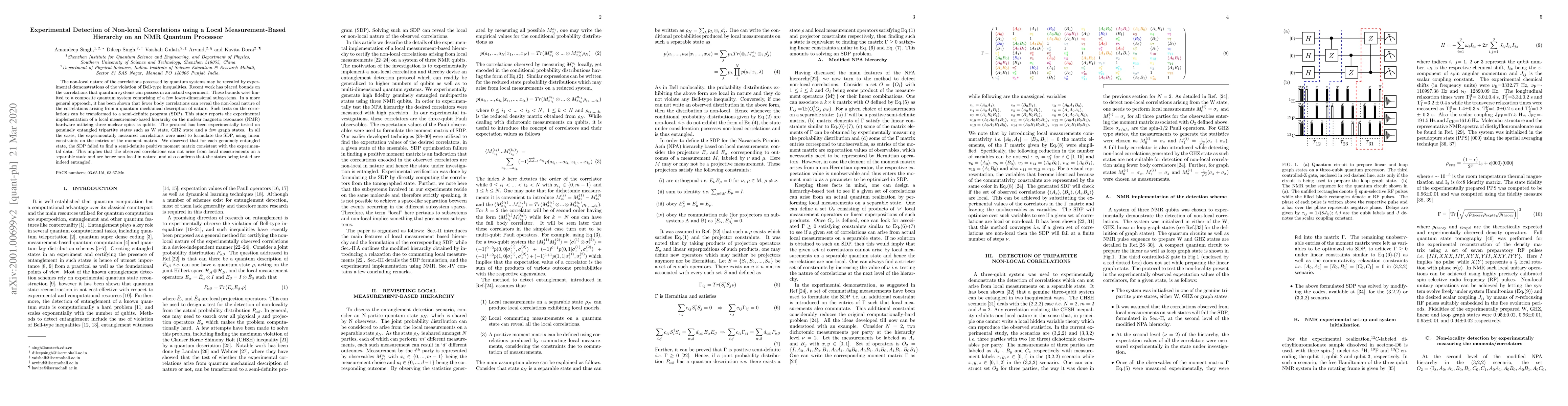 The non-local nature of the correlations possessed by quantum systems may be revealed by experimental demonstrations of the violation of Bell-type inequalities. Recent work has placed bounds on the correlations that quantum systems can possess in an actual experiment. These bounds were limited to a composite quantum system comprising of a few lower-dimensional subsystems. In a more general approach, it has been shown that fewer body correlations can reveal the non-local nature of the correlations arising from a quantum mechanical description of nature. Such tests on the correlations can be transformed to a semi-definite program (SDP). This study reports the experimental implementation of a local measurement-based hierarchy on the nuclear magnetic resonance (NMR) hardware utilizing three nuclear spins as qubits. The protocol has been experimentally tested on genuinely entangled tripartite states such as W state, GHZ state and a few graph states. In all the cases, the experimentally measured correlations were used to formulate the SDP, using linear constraints on the entries of the moment matrix. We observed that for each genuinely entangled state, the SDP failed to find a semi-definite positive moment matrix consistent with the experimental data. This implies that the observed correlations can not arise from local measurements on a separable state and are hence non-local in nature, and also confirms that the states being tested are indeed entangled.