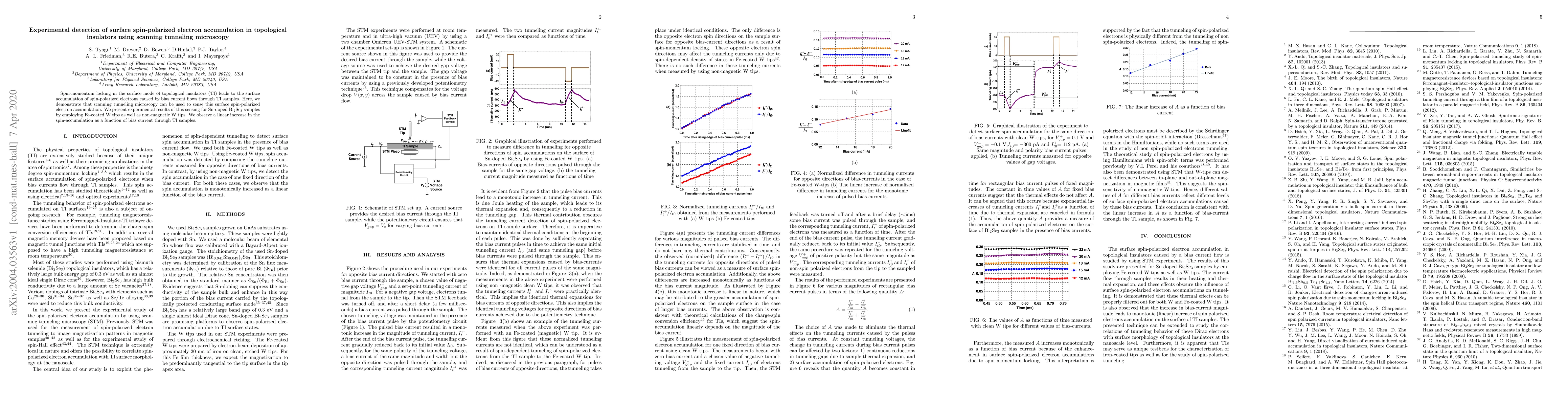 This study demonstrates the use of scanning tunneling microscopy to detect surface spin-polarized electron accumulation in topological insulators, specifically Sn-doped Bi$_2$Se$_3$, showing a linear correlation with bias current and confirming spin-momentum locking effects. Experimental results compare Fe-coated W tips with non-magnetic W tips.