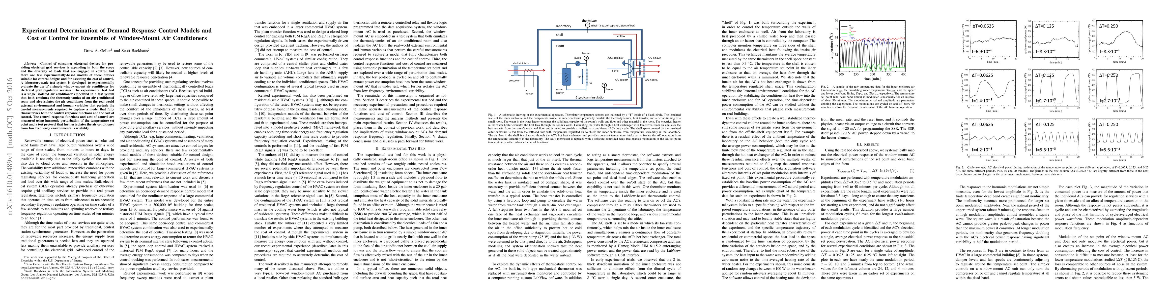 Control of consumer electrical devices for providing electrical grid services is expanding in both the scope and the diversity of loads that are engaged in control, but there are few experimentally-based models of these devices suitable for control designs and for assessing the cost of control. A laboratory-scale test system is developed to experimentally evaluate the use of a simple window-mount air conditioner for electrical grid regulation services. The experimental test bed is a single, isolated air conditioner embedded in a test system that both emulates the thermodynamics of an air conditioned room and also isolates the air conditioner from the real-world external environmental and human variables that perturb the careful measurements required to capture a model that fully characterizes both the control response functions and the cost of control. The control response functions and cost of control are measured using harmonic perturbation of the temperature set point and a test protocol that further isolates the air conditioner from low frequency environmental variability.