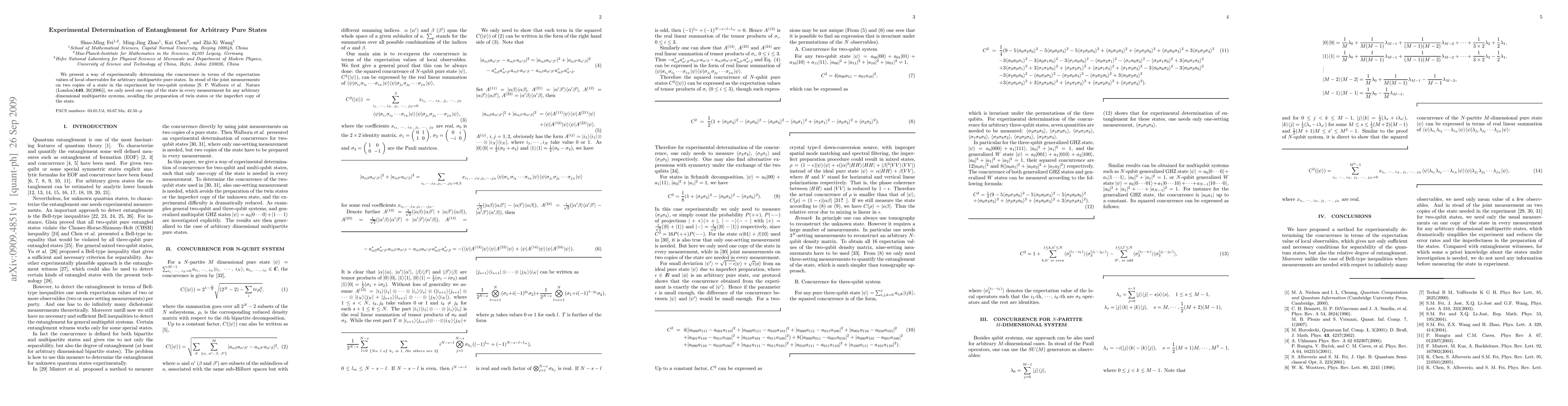We present a way of experimentally determining the concurrence in terms of the expectation values of local observables for arbitrary multipartite pure states. In stead of the joint measurements on two copies of a state in the experiment for two-qubit systems [S. P. Walborn et al. Nature (London)440, 20(2006)], we only need one copy of the state in every measurement for any arbitrary dimensional multipartite systems, avoiding the preparation of twin states or the imperfect copy of the state.