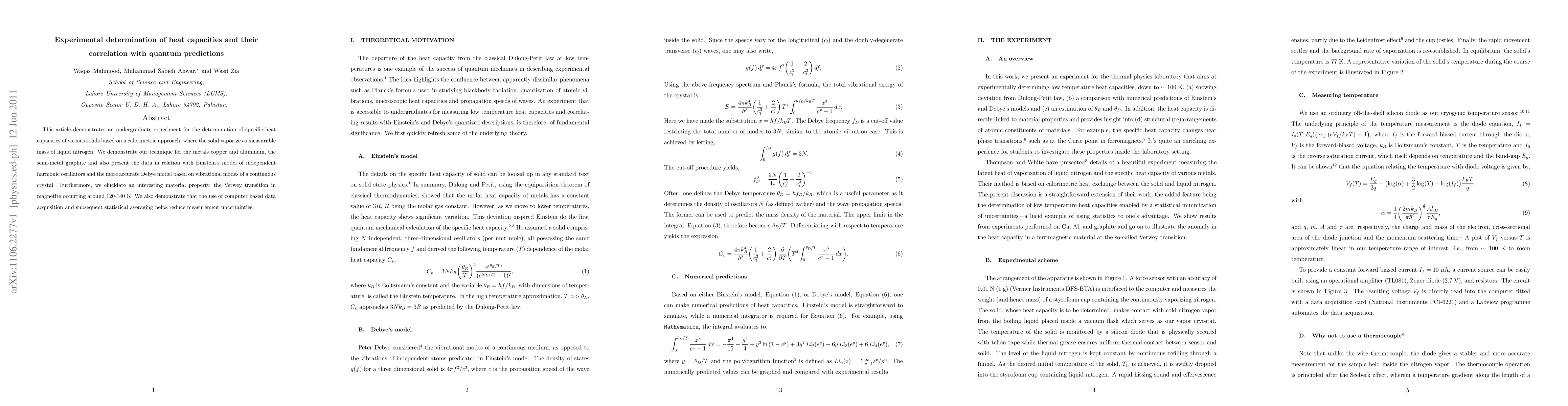 This paper details an undergraduate experiment to measure specific heat capacities of solids like copper, aluminum, and graphite using a calorimetric method involving liquid nitrogen. The results are correlated with quantum models, including Einstein's and Debye's theories, highlighting the Verwey transition in magnetite and the benefits of computer-based data acquisition for reducing uncertainties.