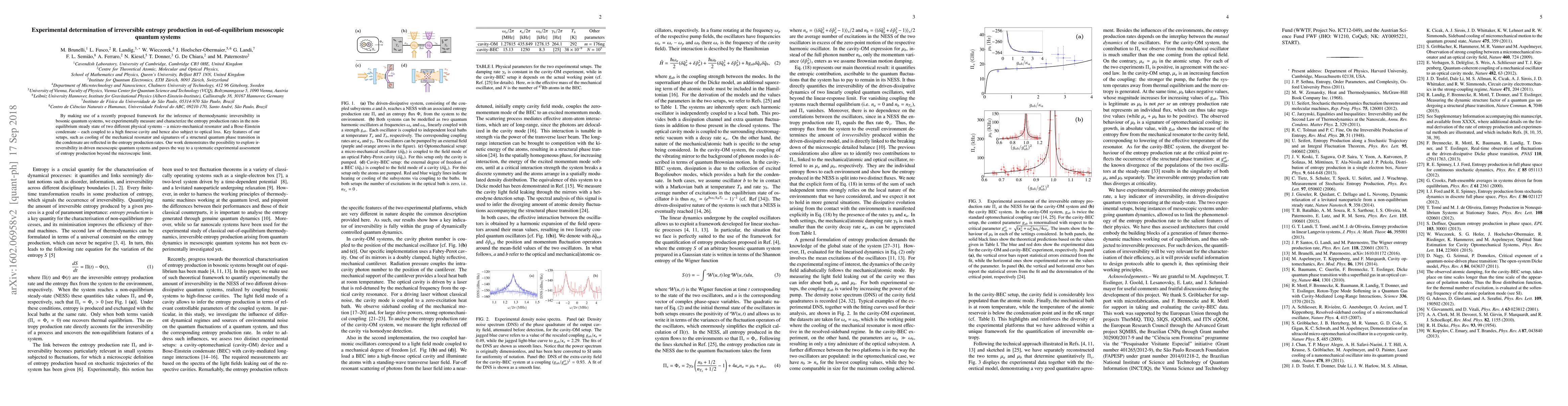 This paper experimentally measures entropy production rates in non-equilibrium steady states of a micro-mechanical resonator and a Bose-Einstein condensate, using a novel framework for thermodynamic irreversibility in quantum systems. The study highlights the influence of cooling and quantum phase transitions on entropy production, showcasing the potential for exploring irreversibility in driven mesoscopic quantum systems.