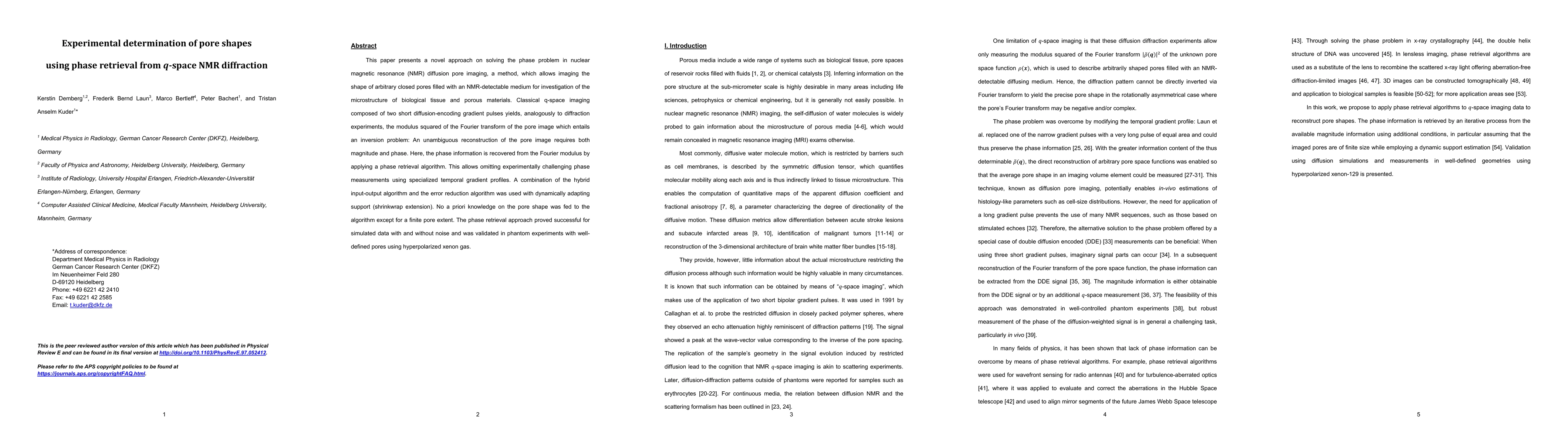 This paper introduces a phase retrieval method to solve the phase problem in NMR diffusion pore imaging, enabling the reconstruction of pore shapes from modulus data without requiring experimental phase measurements. The hybrid input-output and error reduction algorithms were validated on simulated and phantom data using hyperpolarized xenon gas.