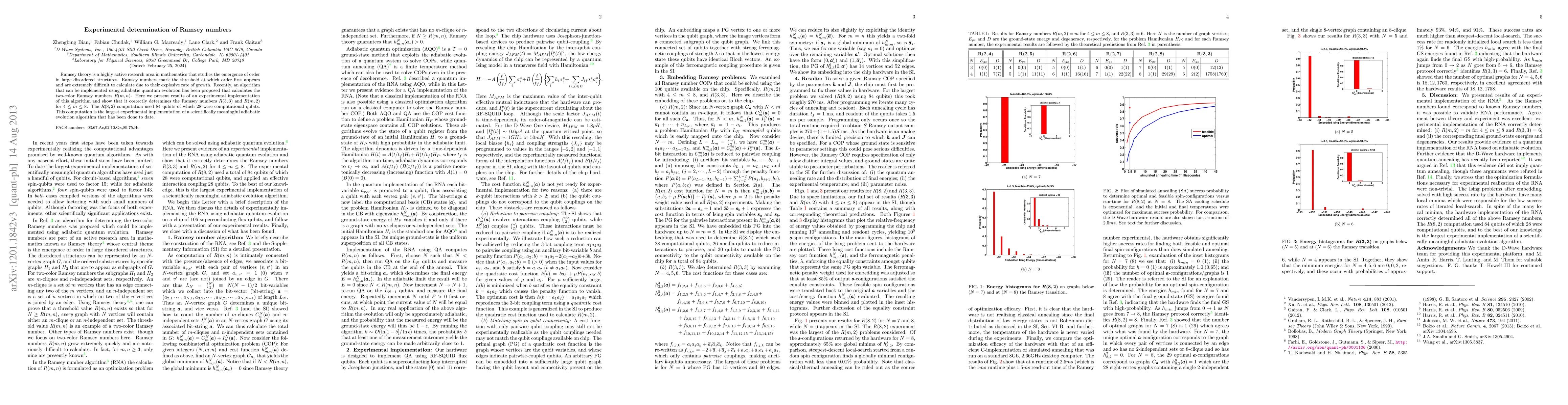 This paper reports on the experimental determination of Ramsey numbers using an adiabatic quantum evolution algorithm, successfully calculating $R(3,3)$ and $R(m,2)$ for $4\leq m\leq 8$, with the largest computation involving 84 qubits for R(8,2).