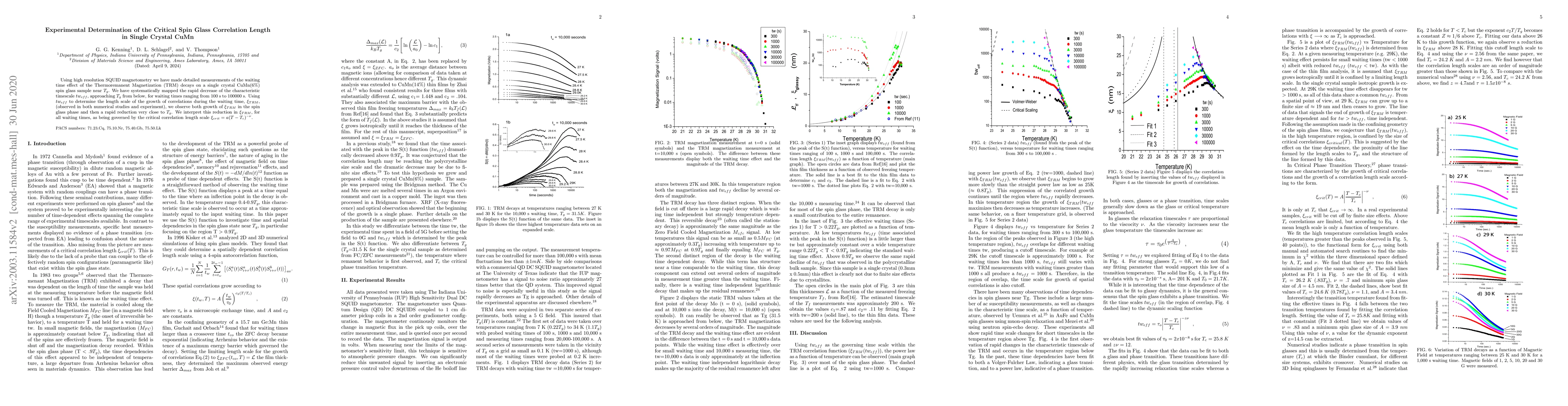 Measuring ThermoRemanent Magnetization (TRM) decays on a single crystal CuMn(6$\%$) spin glass sample, we have systematically mapped the rapid decrease of the characteristic timescale $tw_{eff}$ near $T_g$. Using $tw_{eff}$ to determine the length scale of the growth of correlations during the waiting time, $\xi_{TRM}$, (observed in both numerical studies and experiment), we observe both growth of $\xi_{TRM}$ in the spin glass phase and then a rapid reduction very close to $T_g$. We interpret this reduction in $\xi_{TRM}$, for all waiting times, as being governed by the critical correlation length scale $\xi_{crit}=a(T-T_c)^{-\nu}$.