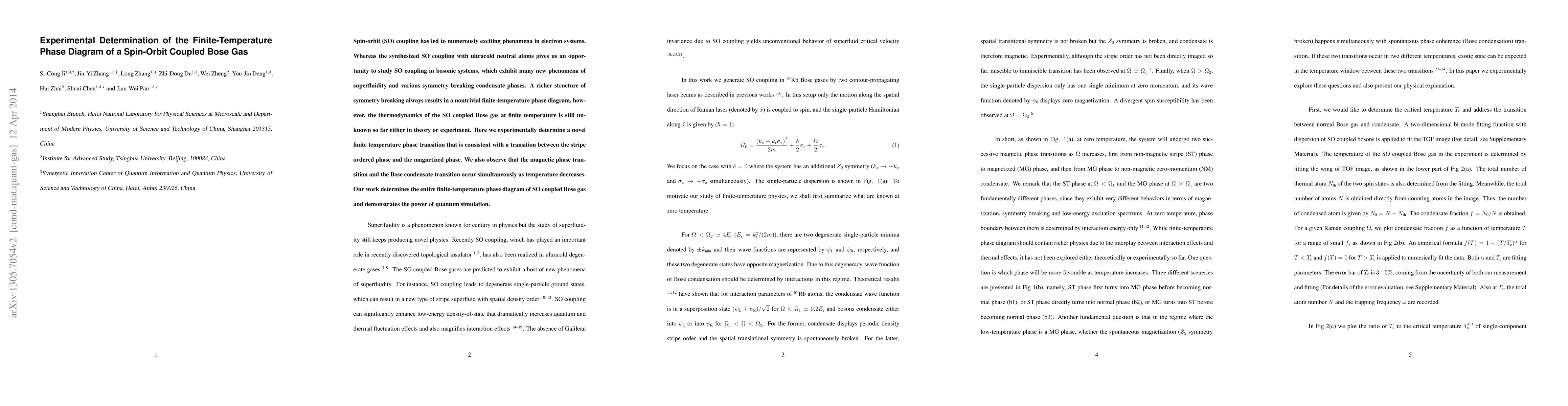 Spin-orbit (SO) coupling has led to numerously exciting phenomena in electron systems, for instance, the recently discovered topological insulator. The synthesized SO coupling with ultracold neutral atoms opens a new avenue of quantum simulation, and gives us an opportunity to study SO coupling in bosonic systems. Indeed, SO coupling leads to many new phenomena of boson superfluidity and various condensate phases that spontaneously break different symmetries. A richer structure of symmetry breaking always results in a nontrivial finite-temperature phase diagram. While the thermodynamics of the SO coupled Bose gas at finite temperature is still unknown either in theory or experiment. In this work, we experimentally generate the SO coupling in ultracold Rb-87 gas to explore in a large temperature range and get most key features. We discover a novel phase transition between the stripe ordered phase and the magnetized phase, which is reminiscent of temperature-driven transition from the B phase to the A phase in super- fluid Helium-3 and from spin-density-wave to spin nematic transition in iron pnictide. We also observe that the magnetic phase transition and the Bose condensate transition occur simultaneously as temperature decreases. Our work determines the entire finite-temperature phase diagram of SO coupled Bose gas and further demonstrate the power of quantum simulation.