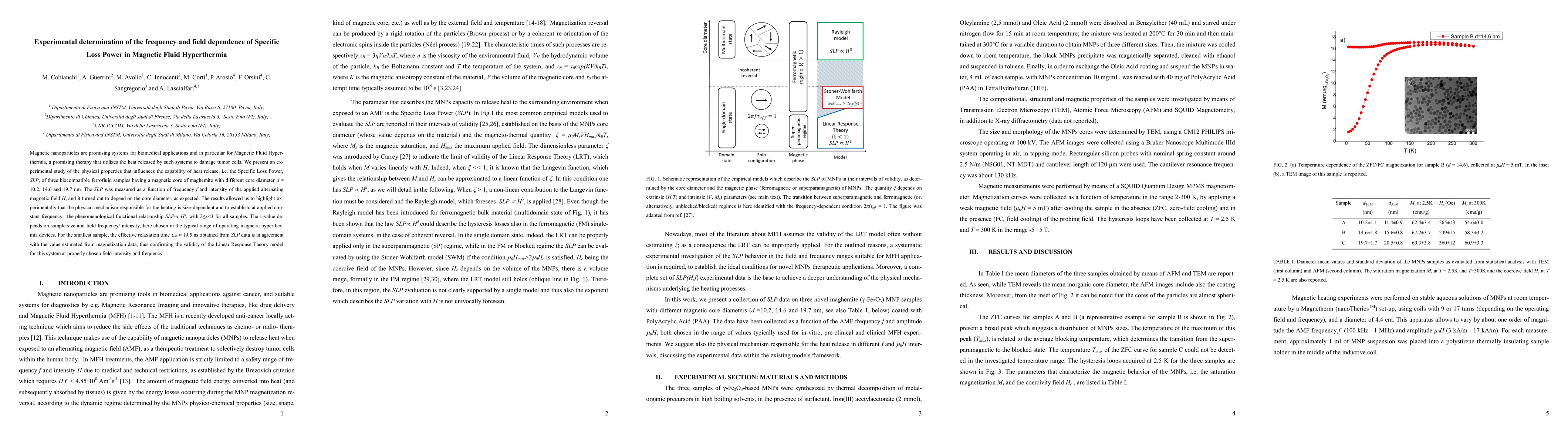 This study experimentally determines the Specific Loss Power (SLP) of magnetic fluid samples for hyperthermia therapy, revealing that SLP depends on the magnetic core diameter and the applied magnetic field's frequency and intensity. The findings establish a phenomenological relationship SLP=cH^x, where x varies with sample size and field parameters, confirming the Linear Response Theory model for the smallest sample.