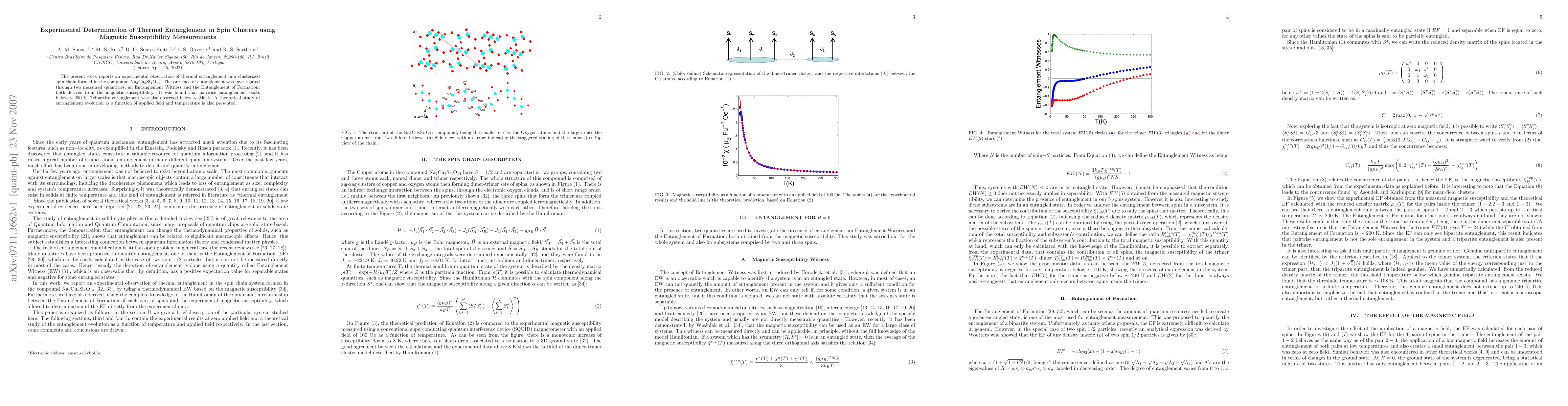 The present work reports an experimental observation of thermal entanglement in a clusterized spin chain formed in the compound Na$_2$Cu$_5$Si$_4$O$_{14}$. The presence of entanglement was investigated through two measured quantities, an Entanglement Witness and the Entanglement of Formation, both derived from the magnetic susceptibility. It was found that pairwise entanglement exists below $ \sim 200$ K. Tripartite entanglement was also observed below $ \sim 240$ K. A theoretical study of entanglement evolution as a function of applied field and temperature is also presented.