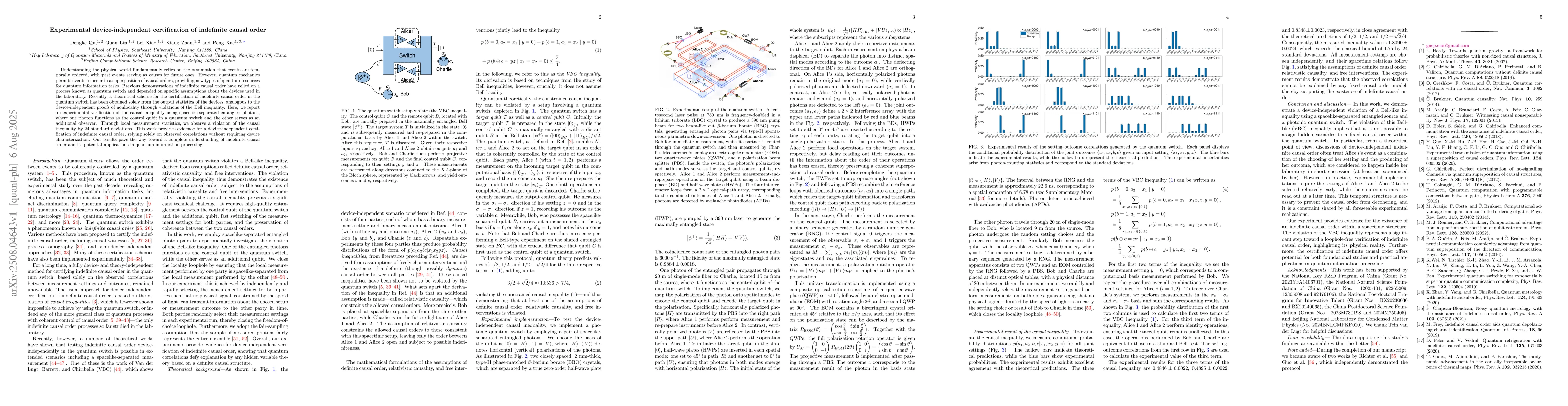 Understanding the physical world fundamentally relies on the assumption that events are temporally ordered, with past events serving as causes for future ones. However, quantum mechanics permits events to occur in a superposition of causal orders, providing new types of quantum resources for quantum information tasks. Previous demonstrations of indefinite causal order have relied on a process known as quantum switch and depended on specific assumptions about the devices used in the laboratory. Recently, a theoretical scheme for the certification of indefinite causal order in the quantum switch has been obtained solely from the output statistics of the devices, analogous to the device-independent proofs of nonlocality through violations of the Bell inequality. Here, we report an experimental verification of the causal inequality using spacelike-separated entangled photons, where one photon functions as the control qubit in a quantum switch and the other serves as an additional observer. Through local measurement statistics, we observe a violation of the causal inequality by 24 standard deviations. This work provides evidence for a device-independent certification of indefinite causal order, relying solely on observed correlations without requiring device characterization. Our results pave the way toward a complete understanding of indefinite causal order and its potential applications in quantum information processing.