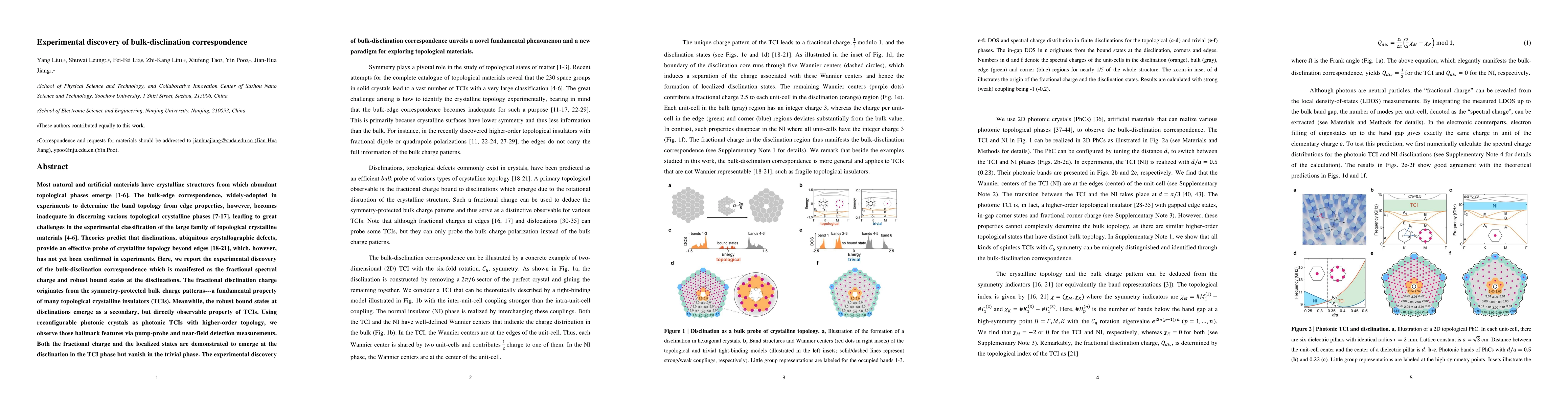 Most natural and artificial materials have crystalline structures from which abundant topological phases emerge [1-6]. The bulk-edge correspondence, widely-adopted in experiments to determine the band topology from edge properties, however, becomes inadequate in discerning various topological crystalline phases [7-17], leading to great challenges in the experimental classification of the large family of topological crystalline materials [4-6]. Theories predict that disclinations, ubiquitous crystallographic defects, provide an effective probe of crystalline topology beyond edges [18-21], which, however, has not yet been confirmed in experiments. Here, we report the experimental discovery of the bulk-disclination correspondence which is manifested as the fractional spectral charge and robust bound states at the disclinations. The fractional disclination charge originates from the symmetry-protected bulk charge patterns---a fundamental property of many topological crystalline insulators (TCIs). Meanwhile, the robust bound states at disclinations emerge as a secondary, but directly observable property of TCIs. Using reconfigurable photonic crystals as photonic TCIs with higher-order topology, we observe those hallmark features via pump-probe and near-field detection measurements. Both the fractional charge and the localized states are demonstrated to emerge at the disclination in the TCI phase but vanish in the trivial phase. The experimental discovery of bulk-disclination correspondence unveils a novel fundamental phenomenon and a new paradigm for exploring topological materials.