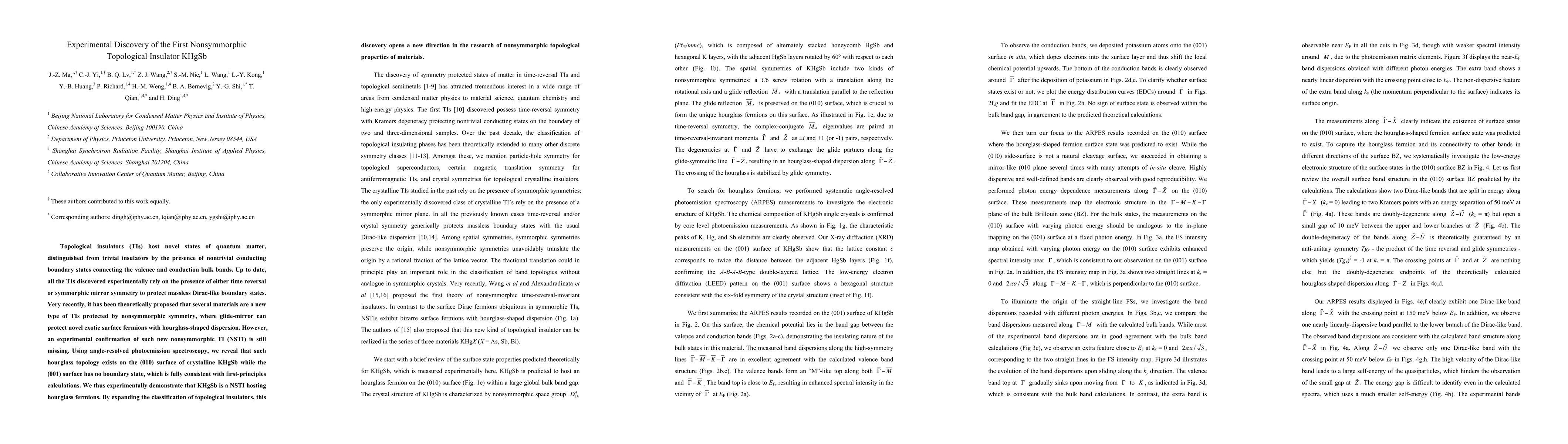 This paper reports the first experimental discovery of KHgSb, a nonsymmorphic topological insulator (NSTI), confirmed via angle-resolved photoemission spectroscopy. The (010) surface of KHgSb exhibits hourglass-shaped exotic surface fermions, expanding the classification of topological insulators.