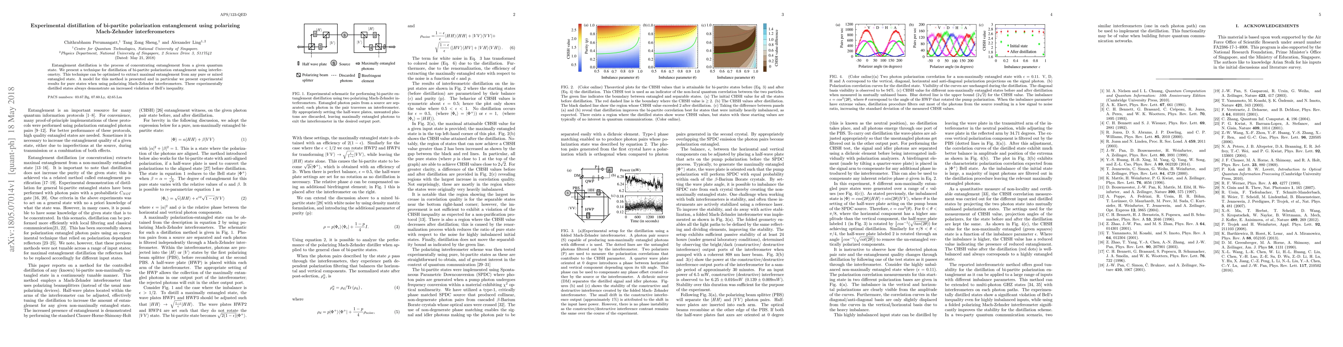 This paper details an experimental method for distilling bi-partite polarization entanglement using polarizing Mach-Zehnder interferometers, showing increased violation of Bell's inequality in the distilled states. The technique aims to optimize the extraction of maximal entanglement from both pure and mixed quantum states.