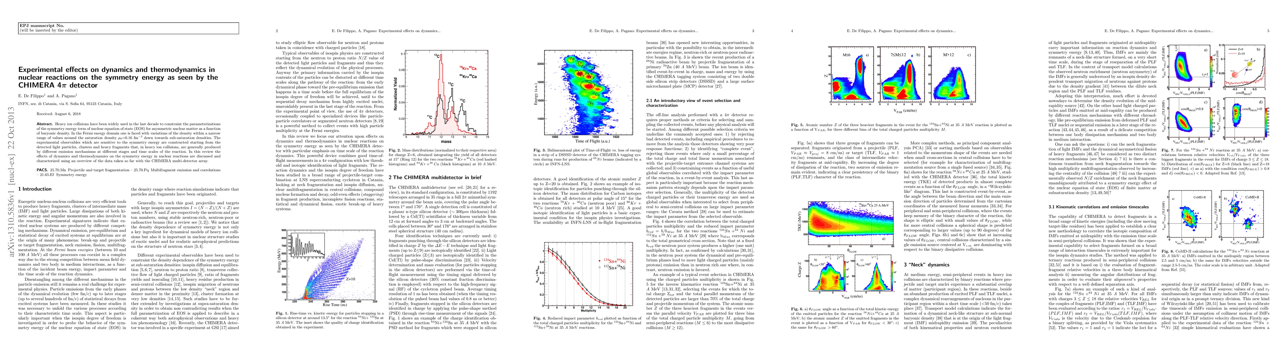 Heavy ion collisions have been widely used in the last decade to constraint the parameterizations of the symmetry energy term of nuclear equation of state (EOS) for asymmetric nuclear matter as a function of baryonic density. In the Fermi energy domain one is faced with variations of the density within a narrow range of values around the saturation density $\rho_0$=0.16 fm$^{-3}$ down towards sub-saturation densities. The experimental observables which are sensitive to the symmetry energy are constructed starting from the detected light particles, clusters and heavy fragments that, in heavy ion collisions, are generally produced by different emission mechanisms at different stages and time scales of the reaction. In this review the effects of dynamics and thermodynamics on the symmetry energy in nuclear reactions are discussed and characterized using an overview of the data taken so far with the CHIMERA multi-detector array.