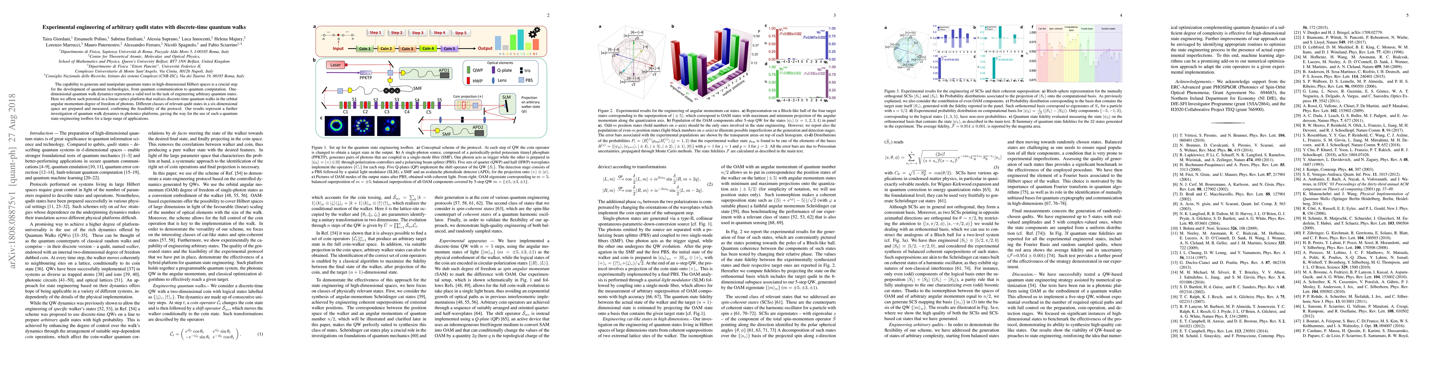 The paper presents a novel experimental engineering strategy for qudit states using discrete-time quantum walks in a linear-optics platform, demonstrating high-fidelity generation of various relevant qudit states in a six-dimensional space.